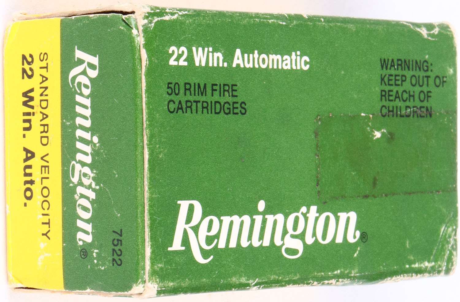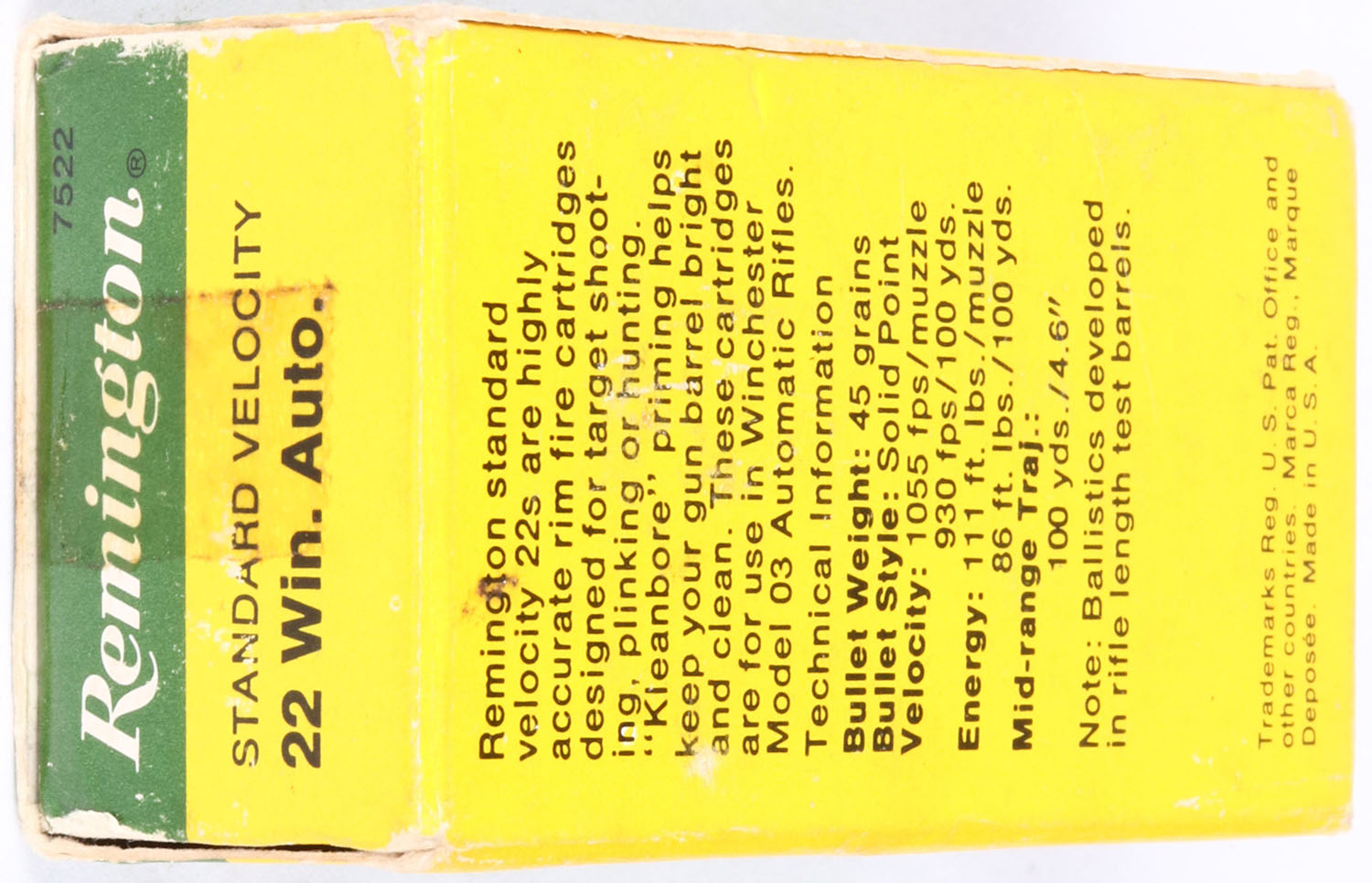 Remington, .22 Winchester Automatic, Standard Velocity, RHWeb: REM-19 WA-1, Full, 1pc. Green yellow & white box, box is solid with excellent color, tape stain on right end, edge & corner wear, end flaps are solid, ammo is minty. Grade: Very Good ++ - Value: 10 to 50