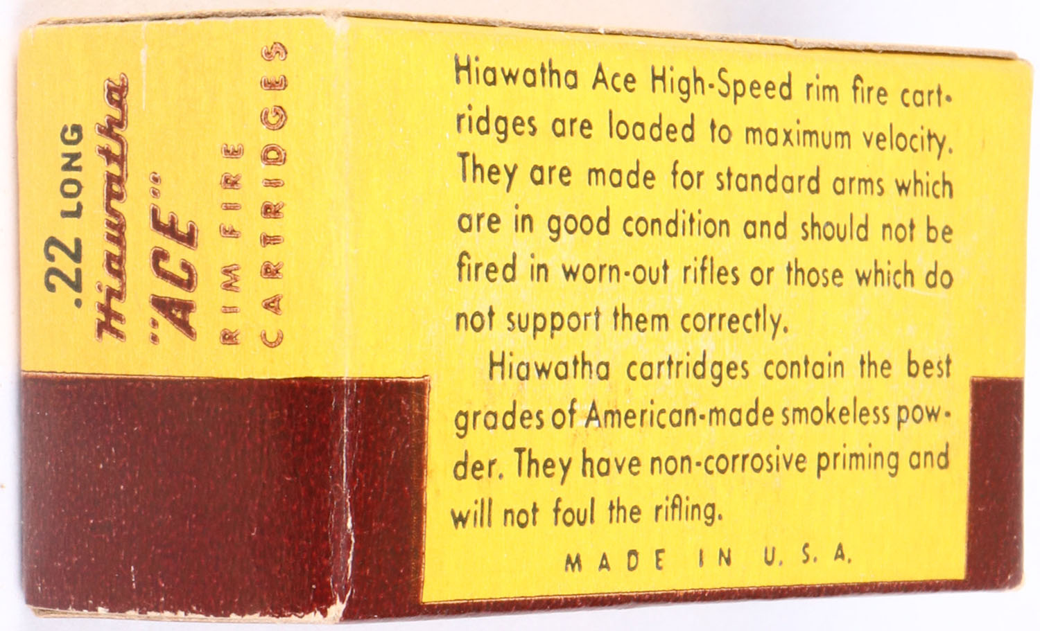 Gambles, Hiawatha ''Ace'', .22 Long, High-Speed, RHWeb: GS-2 L-1, Full, 1pc. Yellow & brown box, box is solid with excellent color, only very minor age soiling, corners are mostly sharp, edges are crisp, end flaps are solid, ammo is excellent. Grade: Excellent ++ - Value: 20 to 60