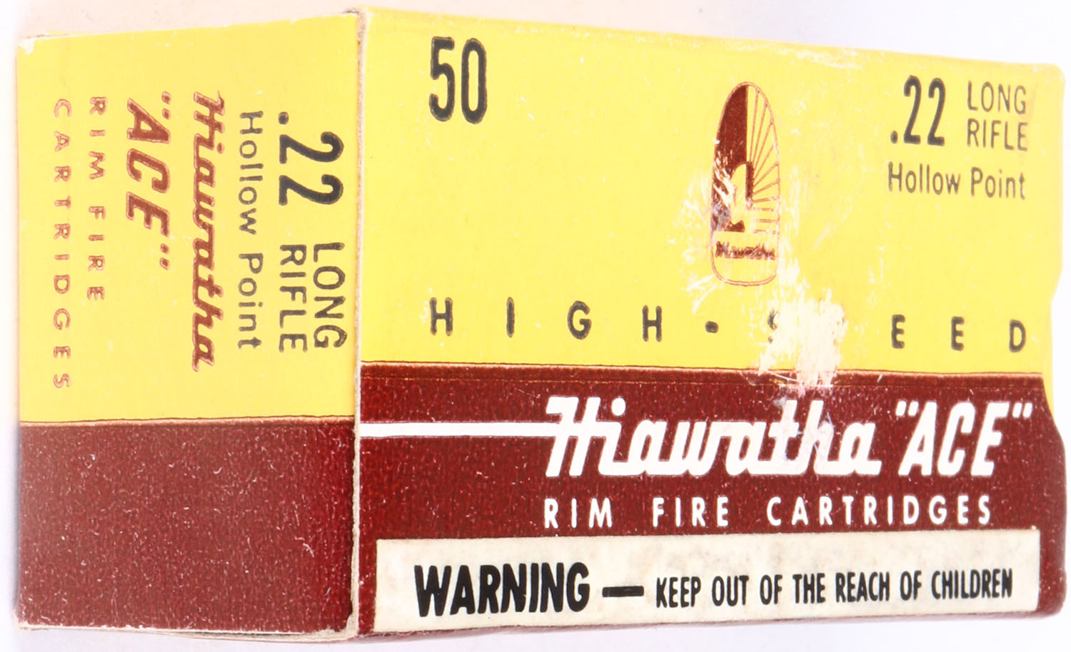 Gambles, Hiawatha ''Ace'', .22 Long Rifle Hollow Point, High-Speed, RHWeb: GS-3 LR-2, Full, 1pc. Yellow & brown box, box is solid with excellent color, very minor shelf wear, corners are mostly sharp, edges are crisp, end flaps are solid, ammo is excellent. Grade: Excellent ++ - Value: 10 to 50