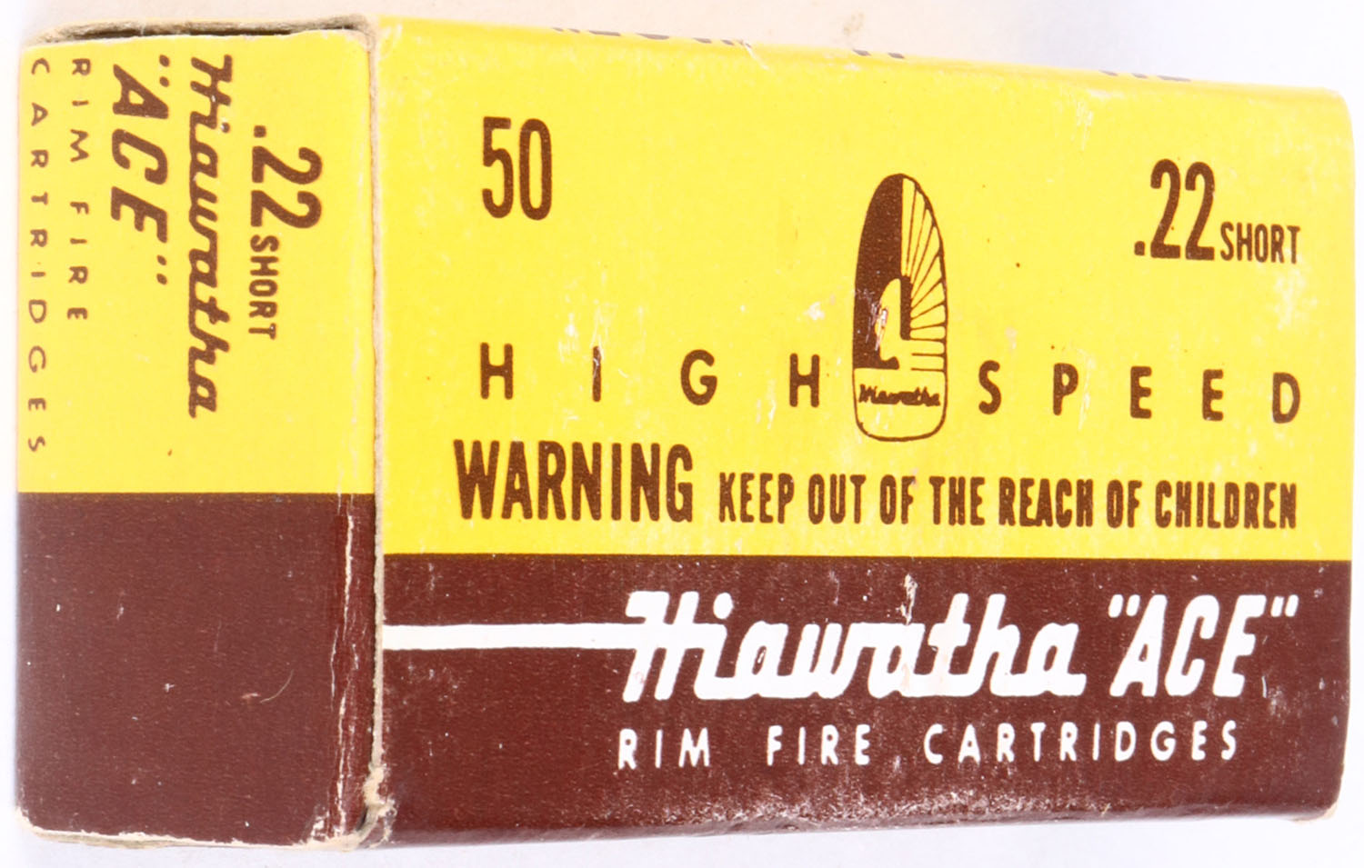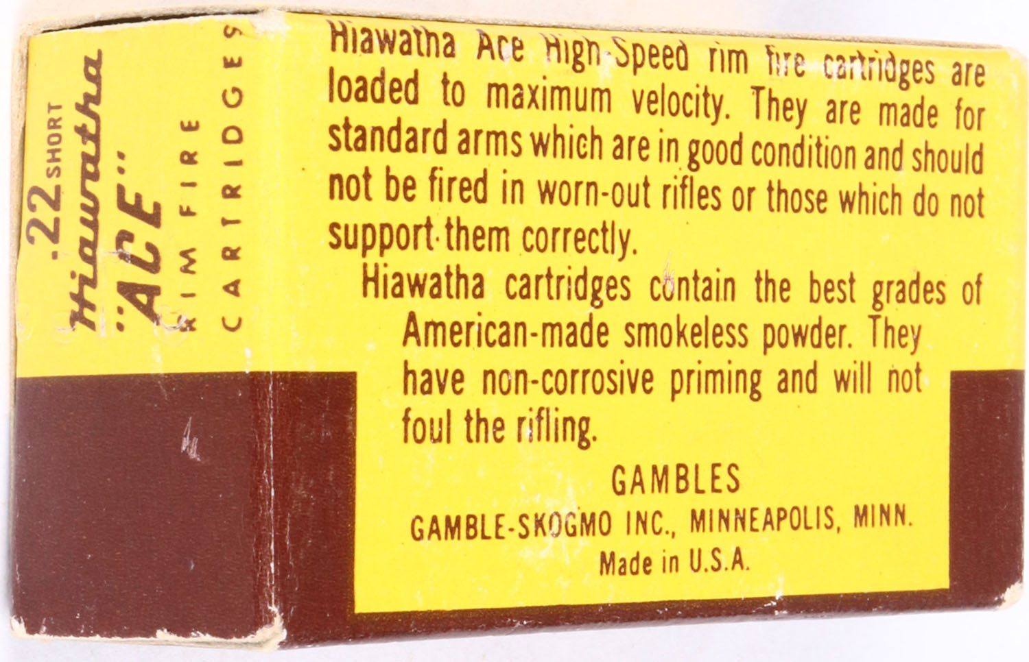 Gambles, Hiawatha ''Ace'', .22 Short, High Speed, RHWeb: GS-4 S-1b, Full, 1pc. Yellow & brown box, box is solid with excellent to minty color, very minor corner wear, edges are mostly crisp, end flaps are solid, ammo is excellent. Grade: Excellent + - Value: 10 to 50