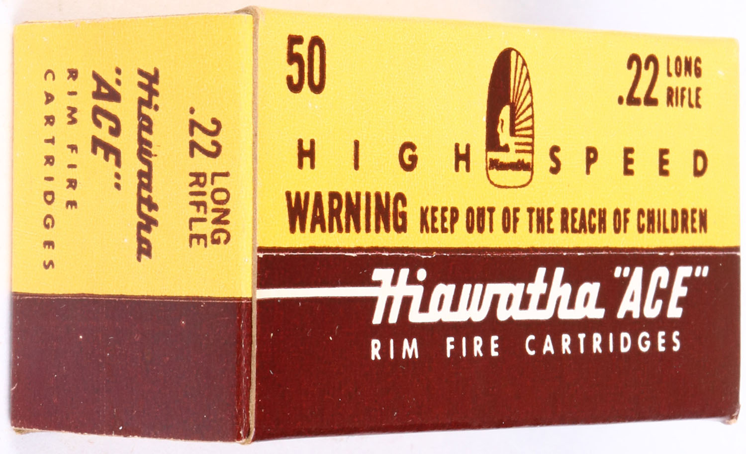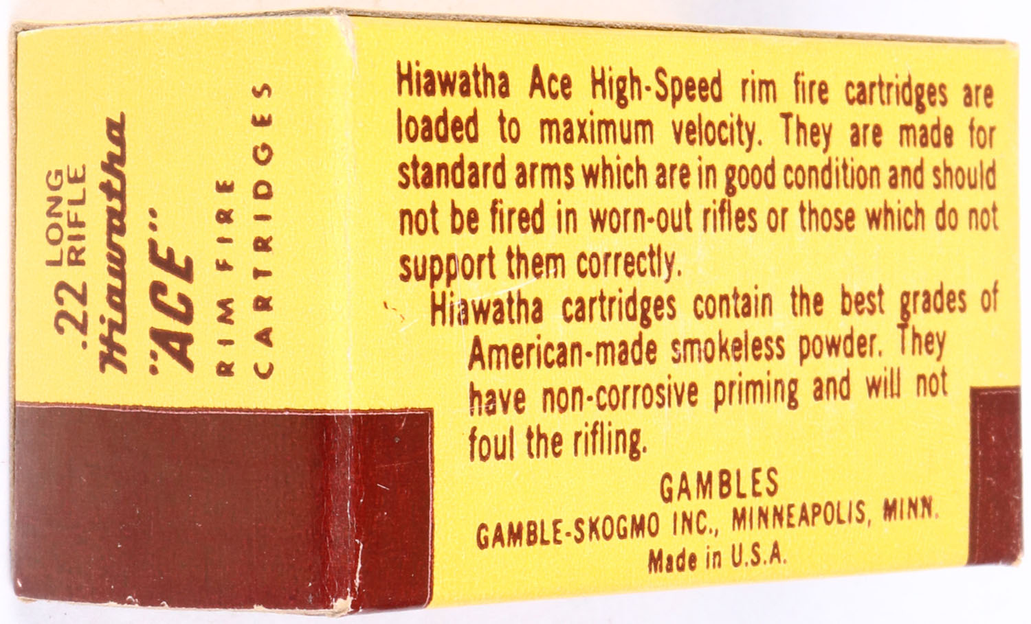 Gambles, Hiawatha ''Ace'', .22 Long Rifle, High Speed, RHWeb: GS-4 LR-1, Full, 1pc. Yellow & brown box, box is near mint with minty color, corners are mostly sharp, edges are crisp, end flaps are solid, ammo is excellent. Grade: MINT - Value: 10 to 50