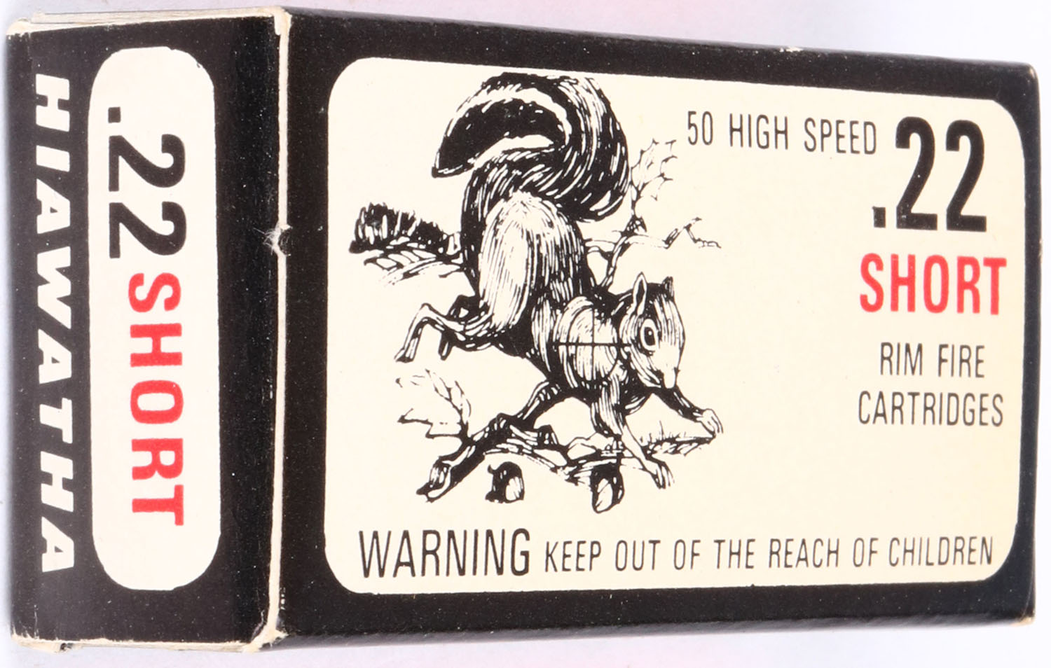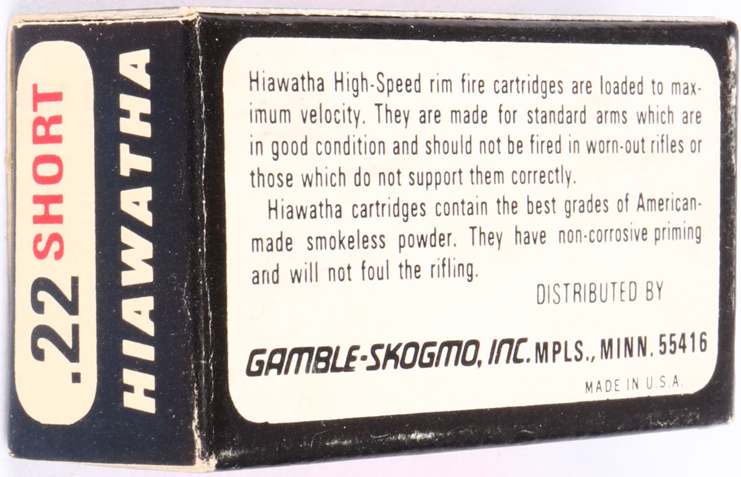 Gambles, Hiawatha, .22 Short, High Speed, RHWeb: GS-5 S-1a, Full, 1pc. White black & red squirrel box, box is solid with excellent color, only very minor age soiling & corner wear, edges are crisp, end flaps are solid, ammo is excellent. Grade: Excellent ++ - Value: 30 to 60