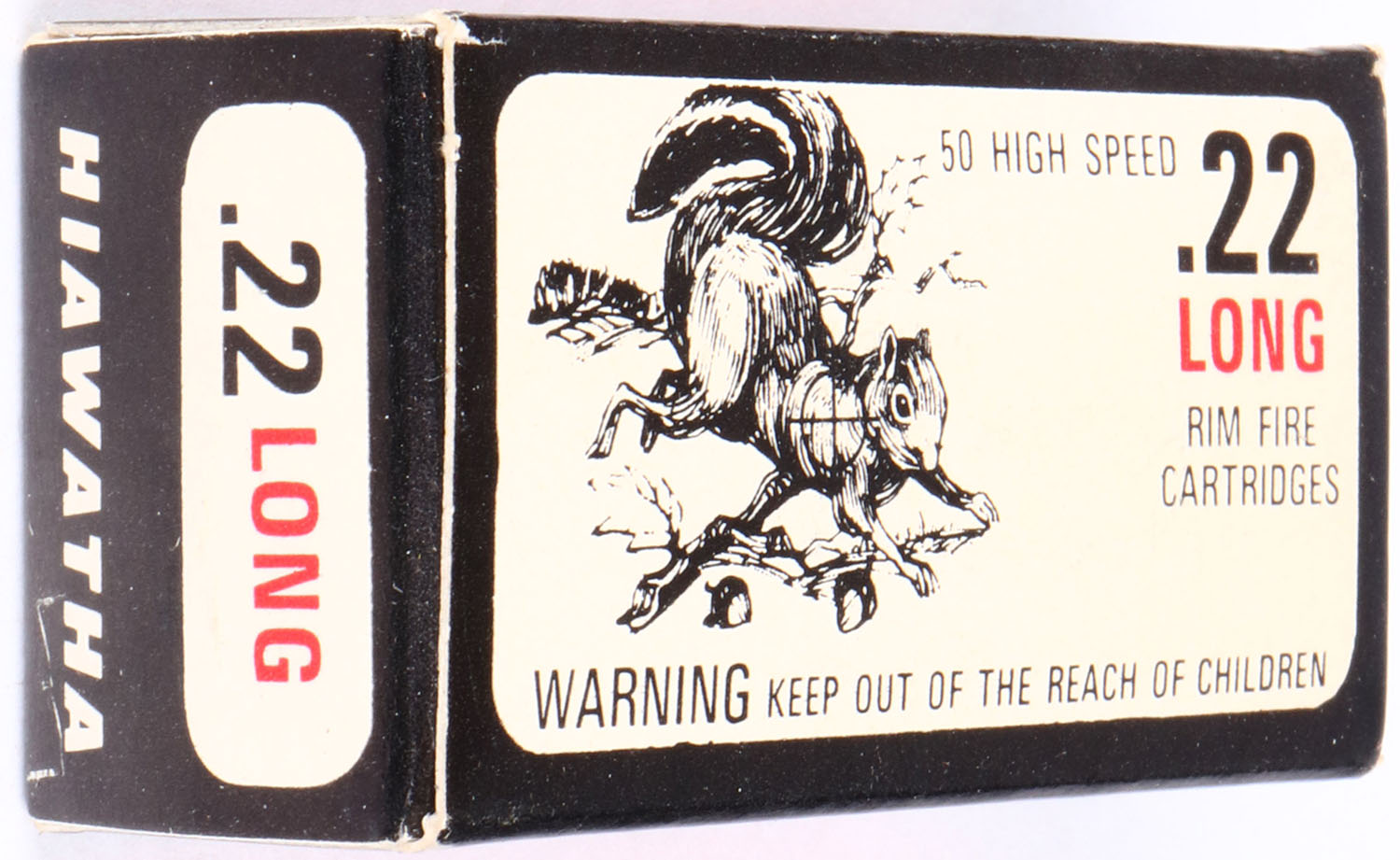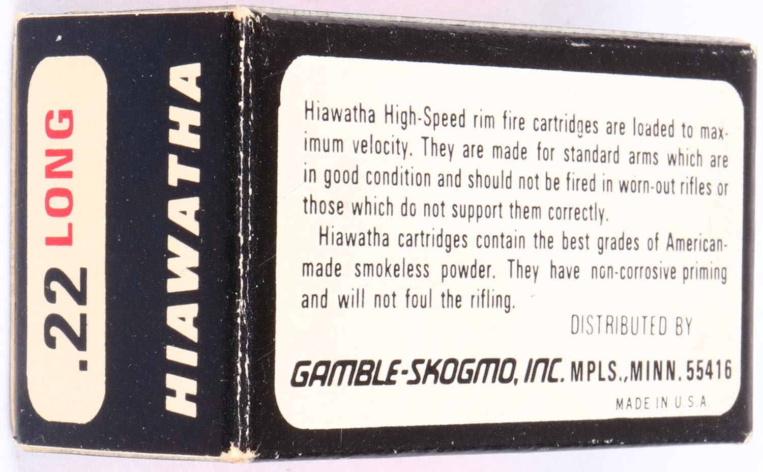 Gambles, Hiawatha, .22 Long, High Speed, RHWeb: GS-5 L-1a, Full, 1pc. White black & red squirrel box, box is solid with excellent color, only very minor age soiling, corners are mostly sharp, edges are crisp, end flaps are solid, ammo is excellent. Grade: Excellent ++ - Value: 20 to 60