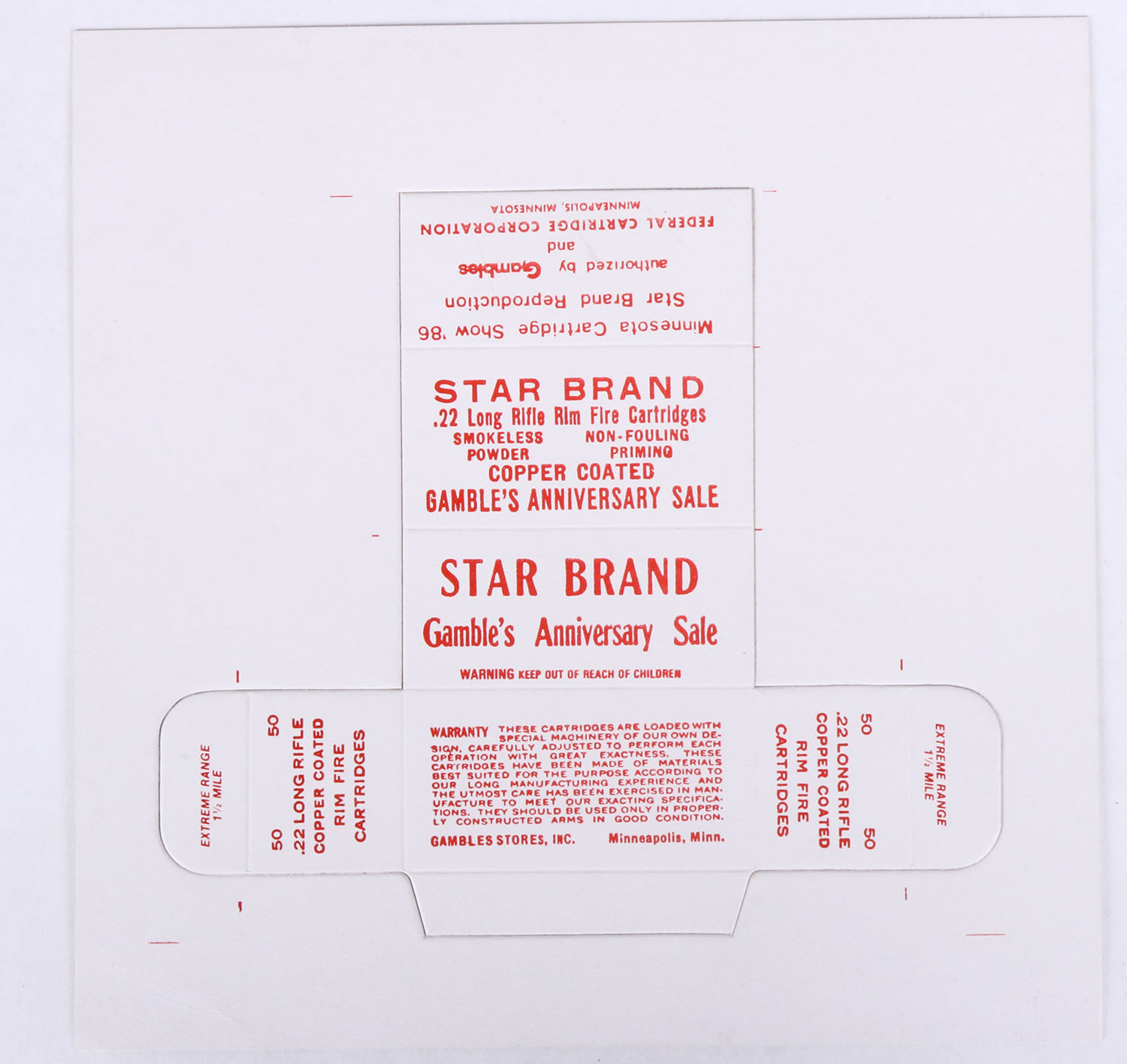 Gambles, Star Brand (Reproduction), .22 Long Rifle, Empty, intact box template, box is MINT with mint color. Grade: MINT - Value: 6 to 60