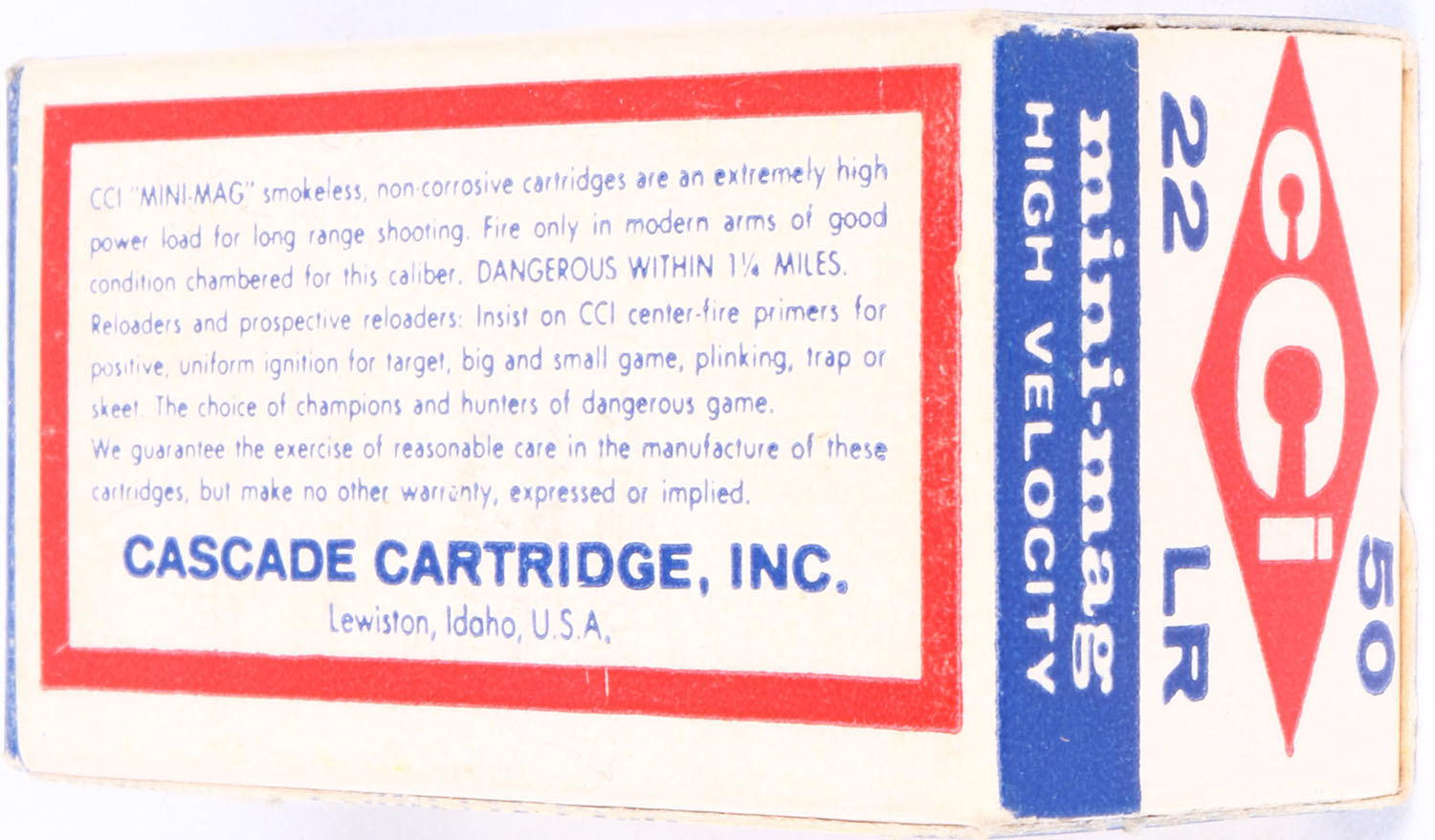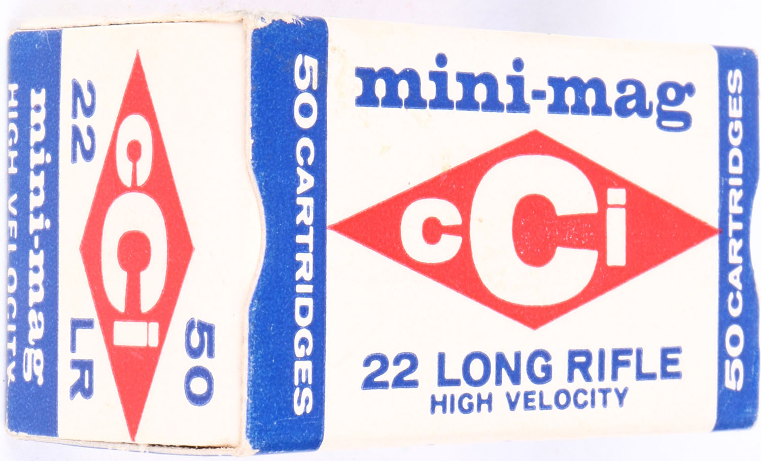 CCi, mini-mag, .22 Long Rifle, High Velocity, RHWeb: CCI-1 LR-6a, Full, 1pc. White blue & red box, box is solid with excellent to minty color, sticker damage on back side, very minor corner wear, edges are crisp, end flaps are solid, ammo is excellent. Grade: Excellent + - Value: 4 to 20