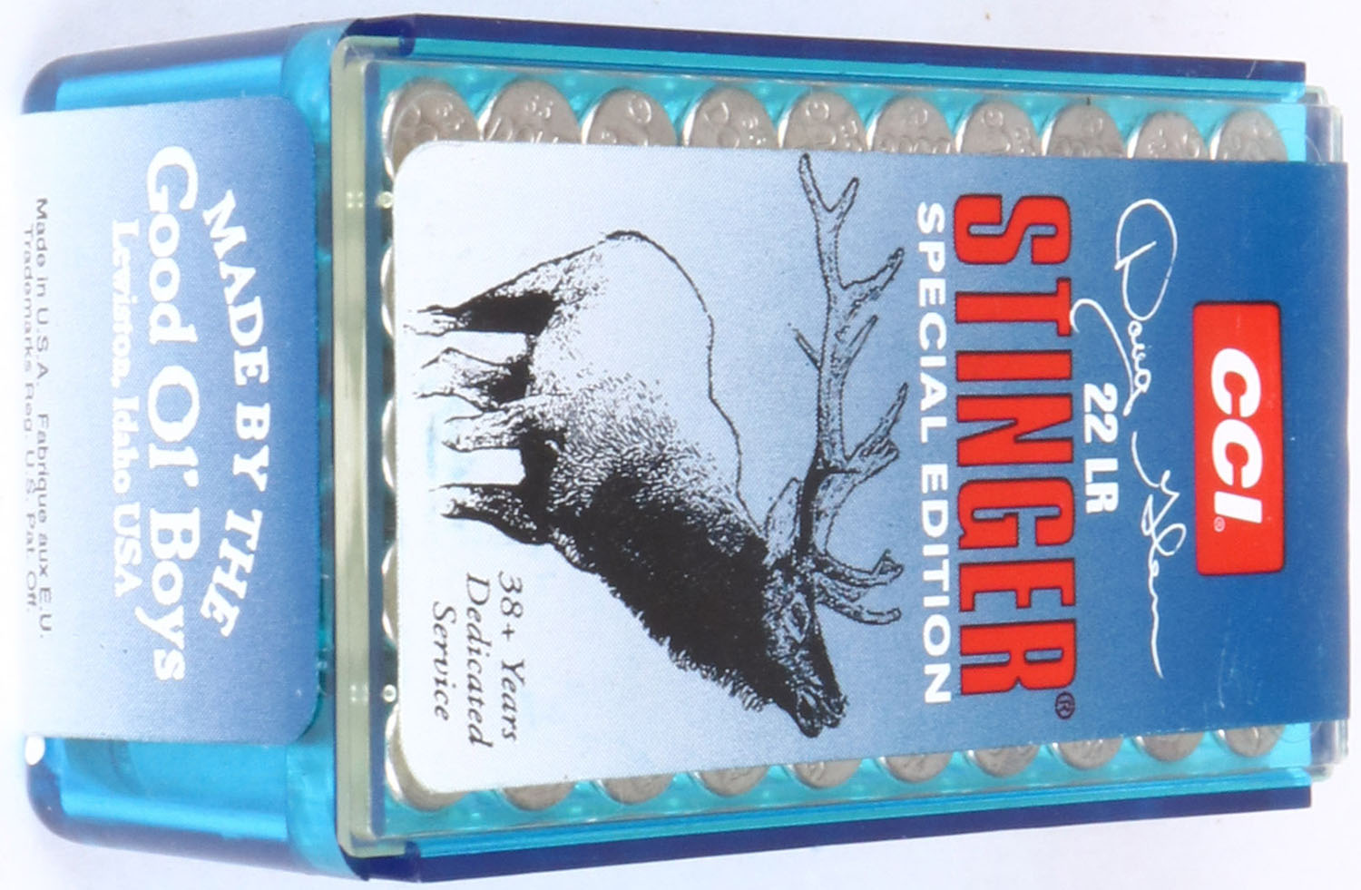 CCi, Doug Glenn Retirement Commemorative box, .22 Long Rifle Stinger, FULL & SEALED, 2pc. Blue & clear plastic tray with multi-colored sealing label, box is MINT with minty color, label is intact, ammo appears minty. Grade: MINT - Value: 40 to 120