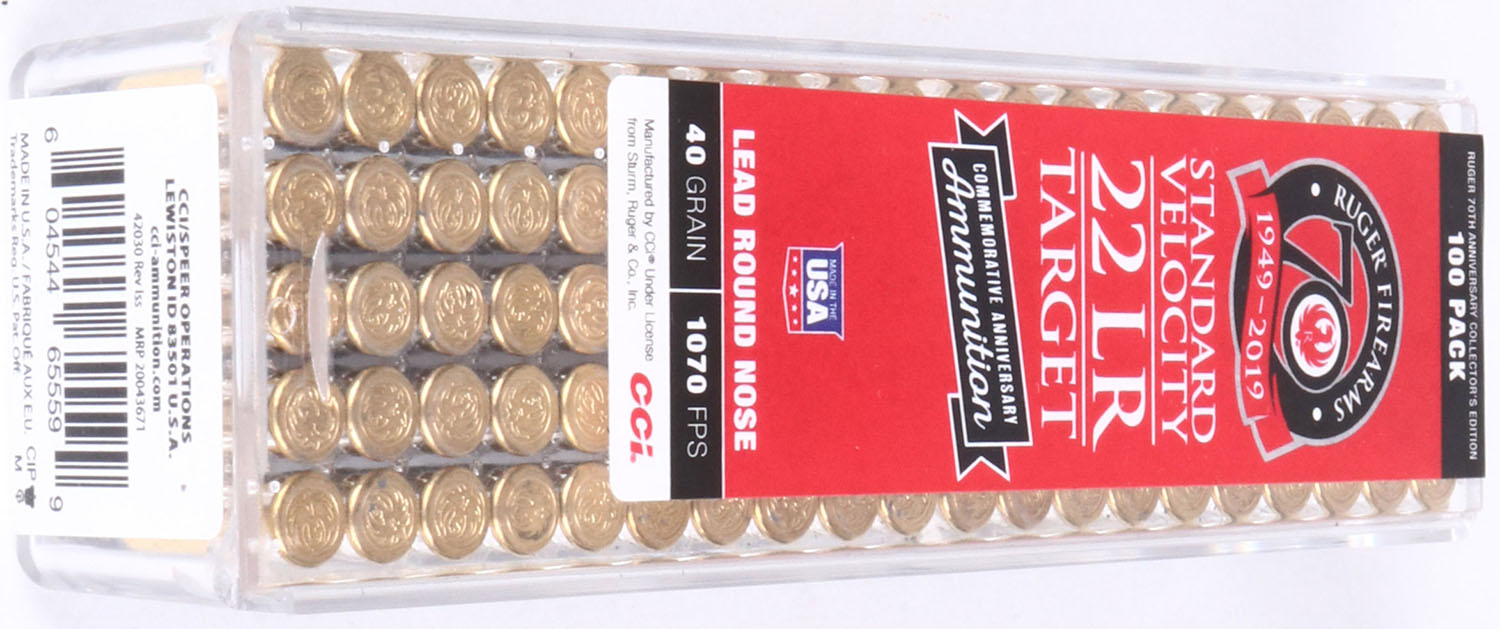 CCi, Ruger 70th anniversary commemorative, .22 Long Rifle, Standard Velocity, Not in RHWeb, Full & Sealed, 2pc. Clear plastic tray with red & black label, box is mint, label is mint, ammo appears mint. Grade: Mint - Value: 20 to 60
