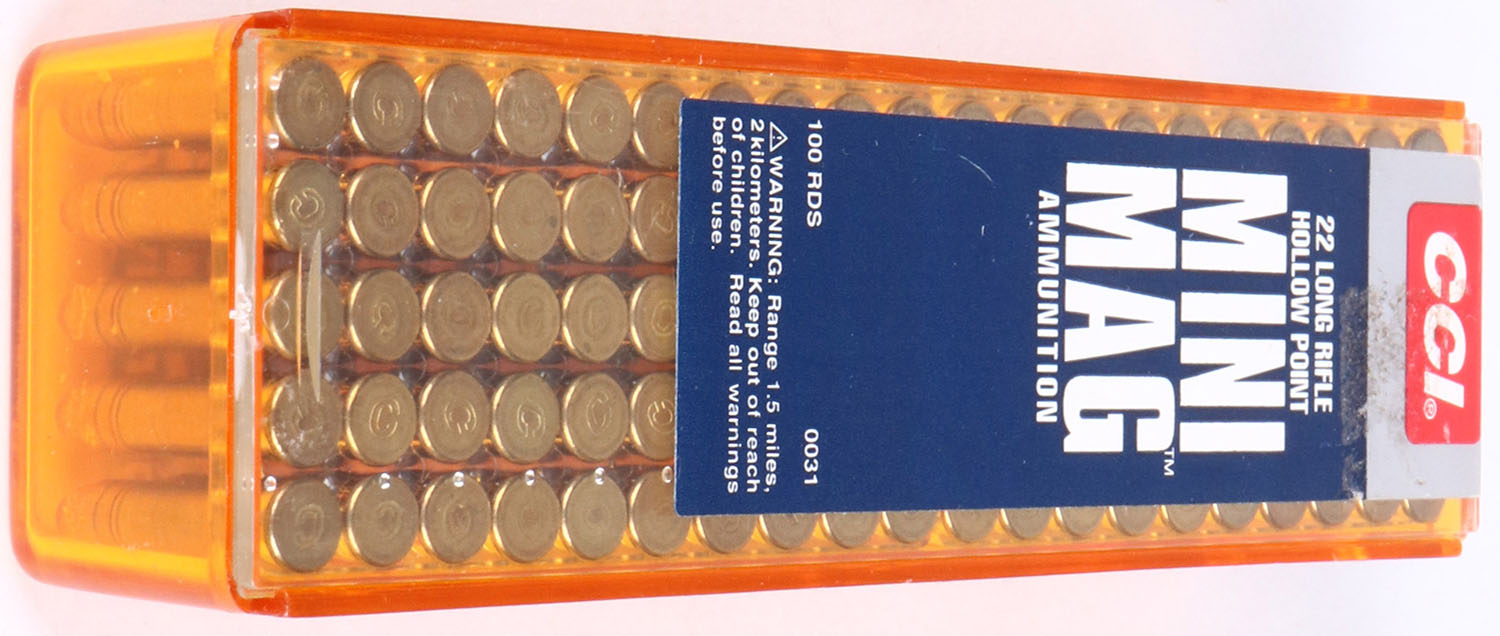 CCi, Mini-Mag, .22 Long Rifle Hollow Point, RHWeb: CCI-6.2A LR-2, Full, 2pc. Amber plastic tray with blue silver & red sealing label, box is solid with excellent color, some sticker residue on top, tray is slightly cloudy, label is intact, ammo appears minty. Grade: Excellent + - Value: 8 to 40
