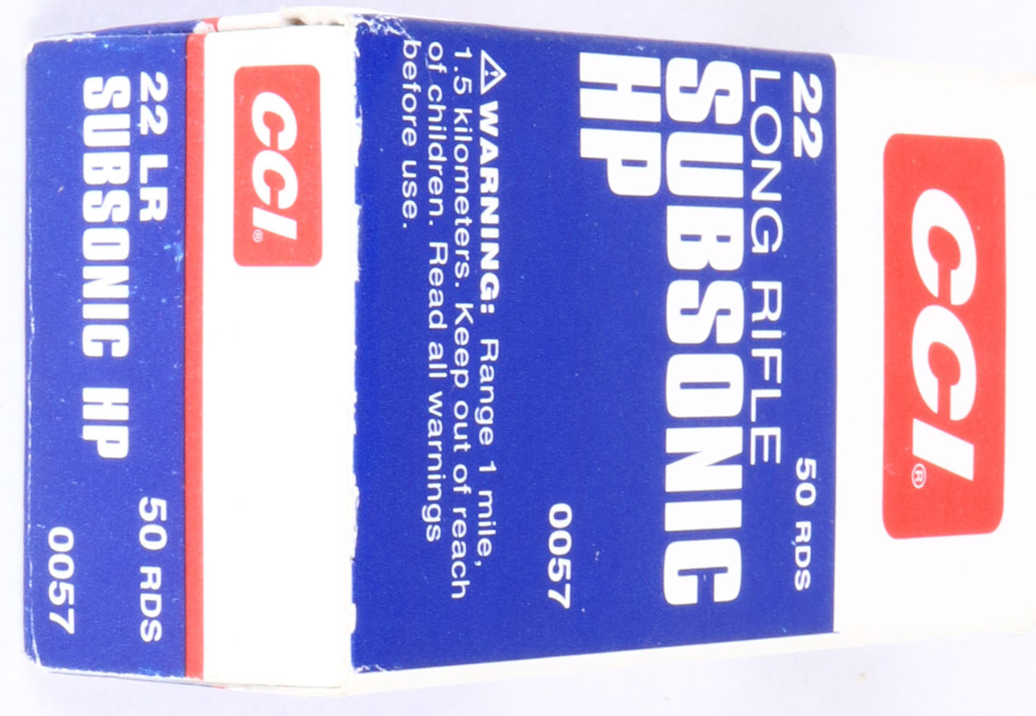 CCi, Subsonic HP, .22 Long Rifle Hollow Point, RHWeb: CCI-8 LR-16, Full, 1pc. White blue & red box, box is near mint with minty color, only has minor corner wear, edges are crisp, end flaps are solid, ammo is minty. Grade: Excellent ++ - Value: 10 to 50