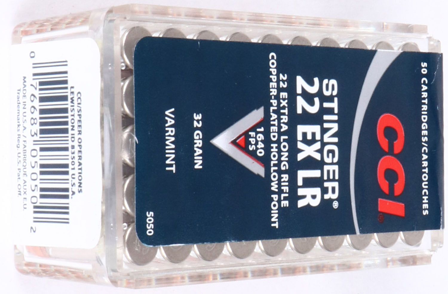 CCi, Stinger, .22 Long Rifle, 32 Grain Copper Plated Hollow Point, 1640 FPS, RHWeb: CCI-11 LR-15, FULL & SEALED, 2pc. Clear plastic tray with blue white & red sealing label, box is MINT with minty color, label is intact, ammo appears minty. Grade: MINT - Value: 10 to 50