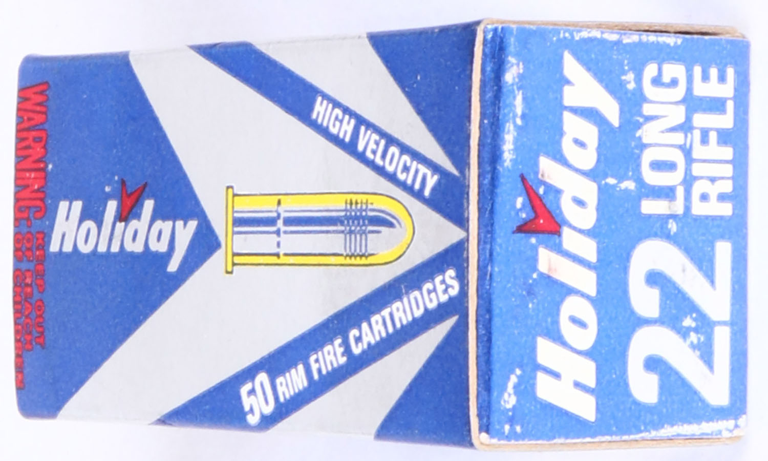 Holiday, .22 Long Rifle, High Velocity, RHWeb: HS-1 LR-1, Full, 1pc. Blue & silver box, box is near mint with minty color, only very minor shelf wear, corners are sharp, edges are crisp, end flaps are solid, ammo is excellent. Grade: Excellent ++ - Value: 20 to 60