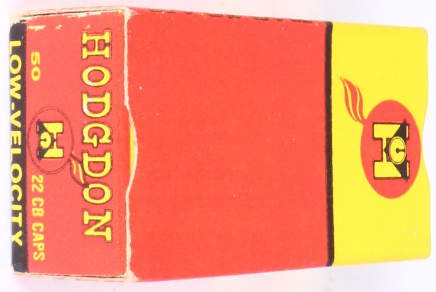 Hodgdon, .22 C.B. Caps, Low-Velocity, RHWeb: HOD-1 CB-1b, Full, 1pc. Red & yellow box, box is MINT with minty color, corners are sharp, edges are crisp, end flaps are solid, ammo is excellent. Grade: MINT - Value: 10 to 50