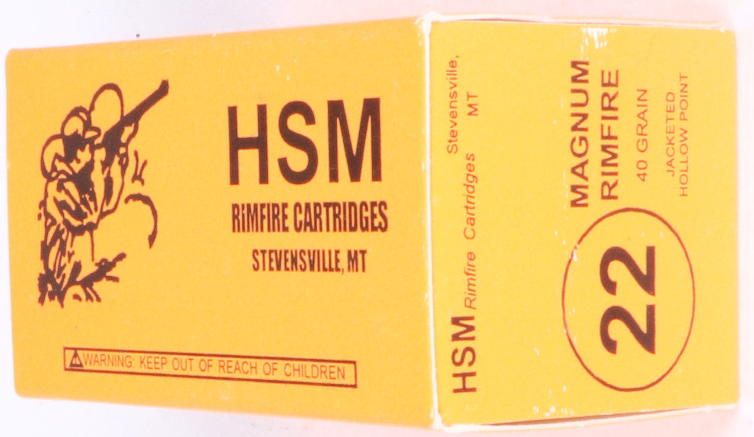 HSM, Rimfire Cartridges, .22 Magnum Rimfire, RHWeb: HSM-1 WMR-1, Full, 1pc. Orange & black box, box is MINT with minty color, corners are sharp, edges are crisp, end flaps are solid, ammo is mint. Grade: Mint - Value: 30 to 90
