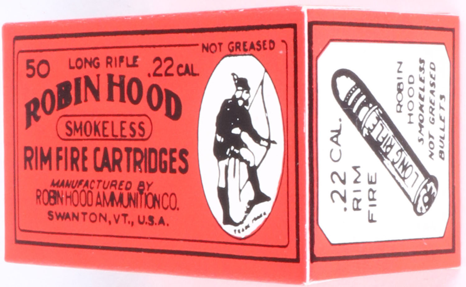 SECCA, Robin Hood Smokeless, .22 Long Rifle, RHWeb: SECCA-2 1994, Full, 1pc. Red black & white box, box is MINT with minty color, corners are solid, edges are crisp, end flaps are solid, ammo is mint. Grade: MINT - Value: 10 to 50