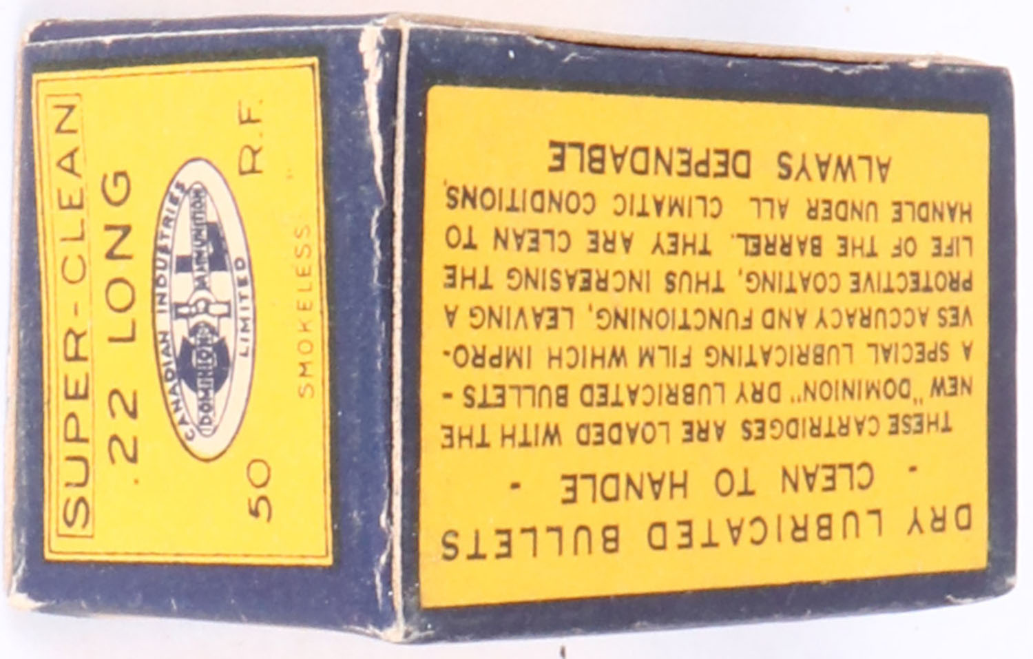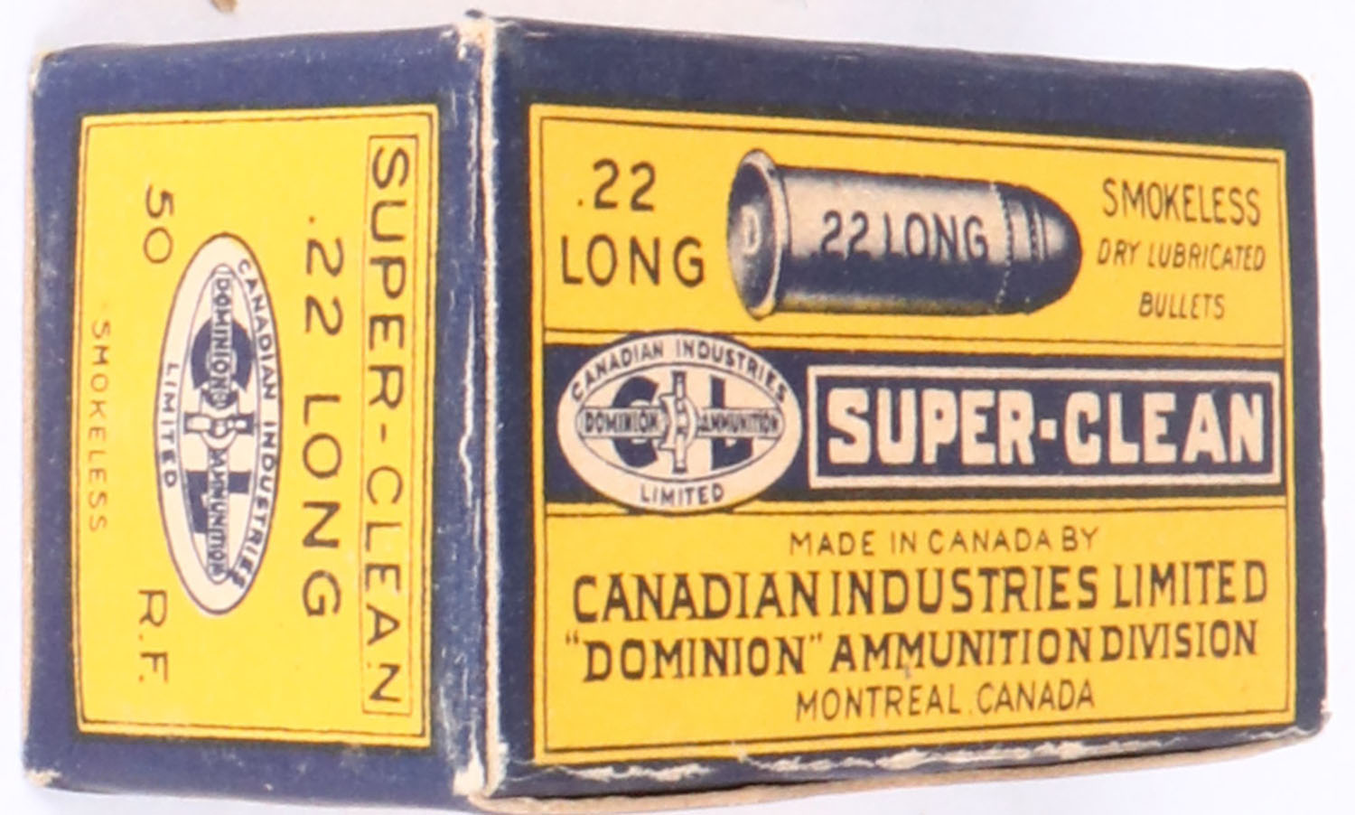 C.I.L., Super-Clean, .22 Long, Smokeless Dry Lubricated, Full, 1pc. Yellow blue & white box, box is solid with excellent color, very minor edge wear, corners are mostly sharp, top flap is solid, ammo is good. Grade: Excellent + - Value: 10 to 50