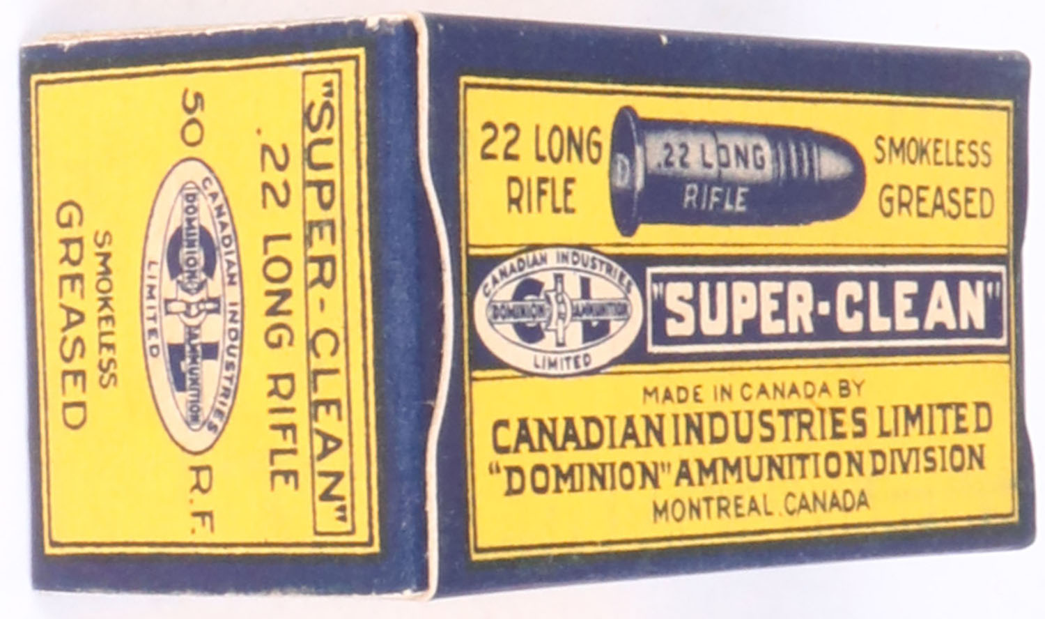 C.I.L., Super-Clean, .22 Long Rifle, Smokeless Greased, Full, 1pc. Yellow blue & white box, box is MINT with minty color, corners are sharp, edges are crisp, end flaps are solid, ammo is excellent. Grade: MINT - Value: 20 to 60