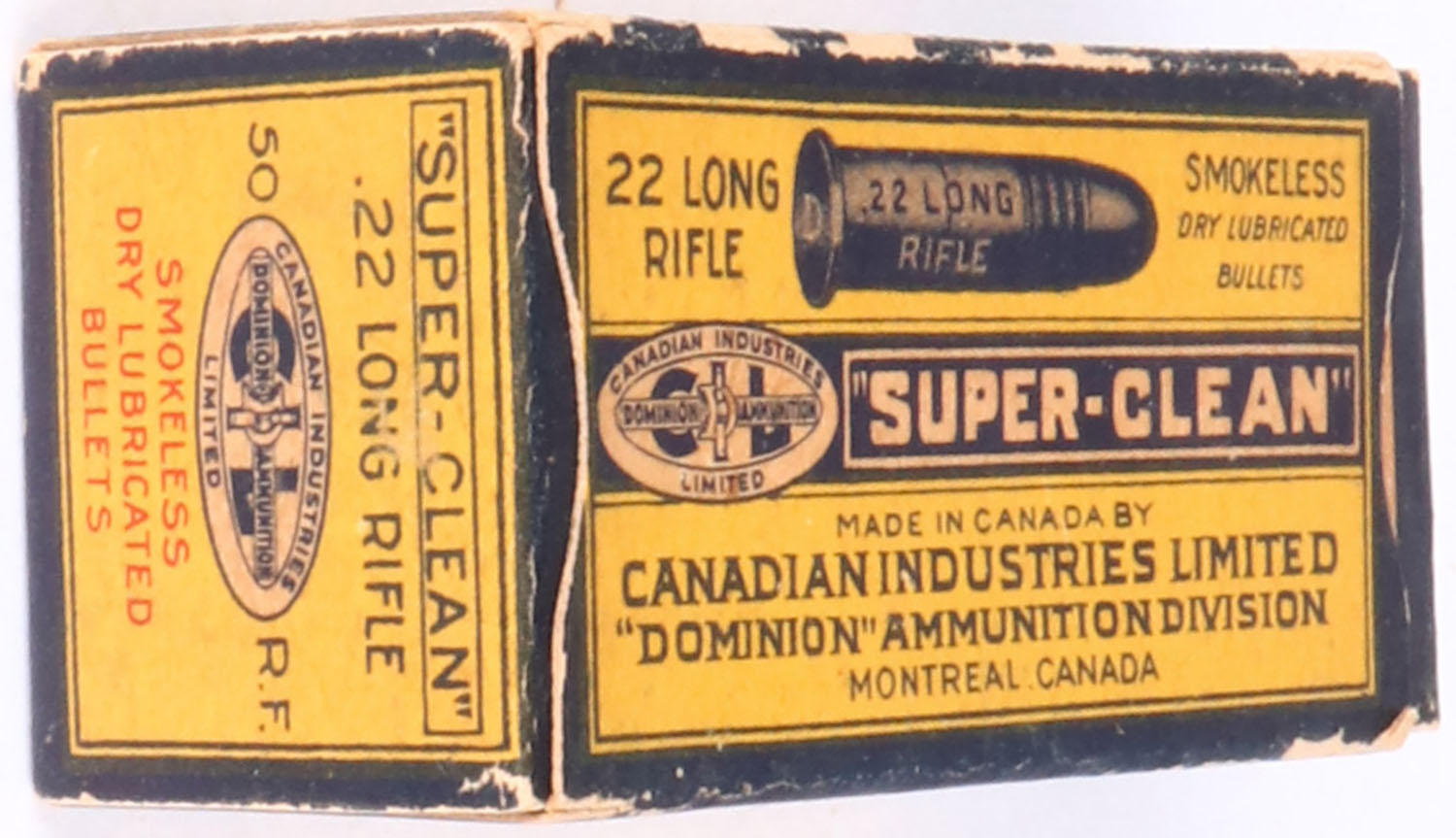 C.I.L., Super-Clean, .22 Long Rifle, Smokeless Dry Lubricated, Full, 1pc. Yellow blue & white box, box is solid with excellent color, minor age soiling, some edge & corner wear, end flaps are solid, ammo is excellent. Grade: Excellent - Value: 8 to 40
