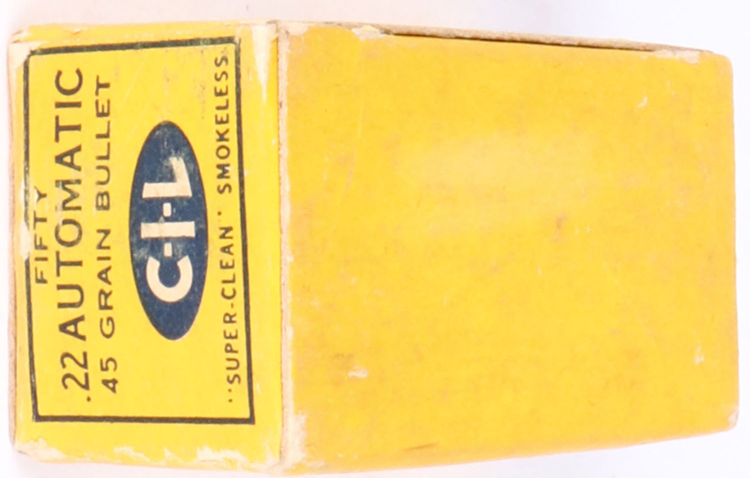 C.I.L., Super-Clean, .22 Automatic, Smokeless Greaseless, Full, 1pc. Yellow blue & buff box, box is solid with excellent color, very minor age soiling, very minor edge & corner wear, top flap is solid, ammo is excellent. Grade: Excellent - Value: 10 to 50