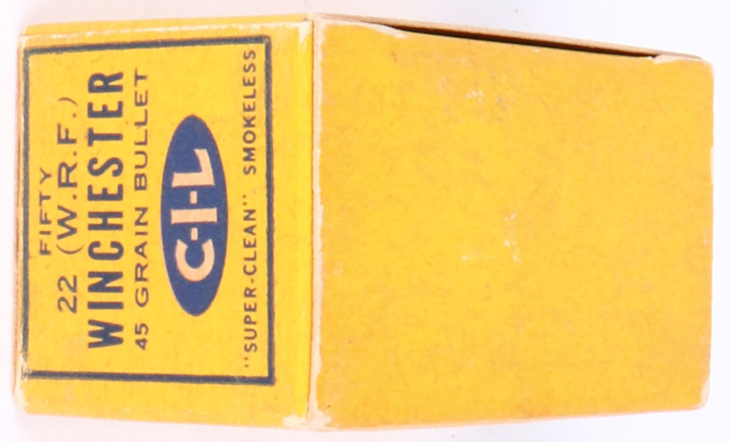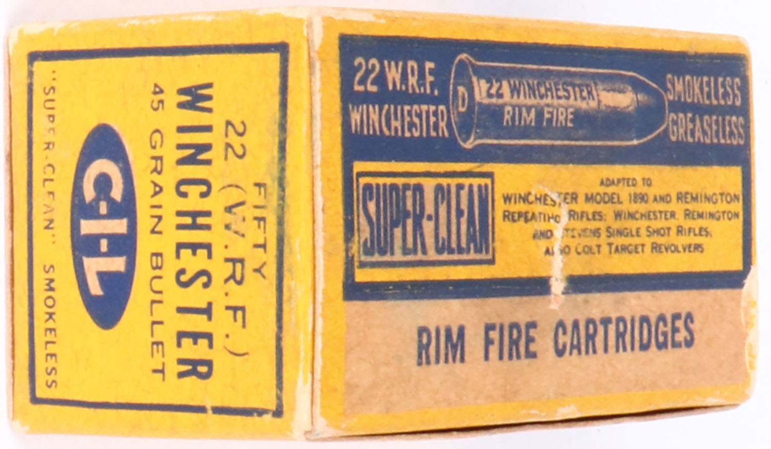 C.I.L., Super-Clean, .22 W.R.F., Smokeless Greaseless, Full, 1pc. Yellow blue & buff box, box is solid with excellent color, minor age soiling, very minor corner wear, edges are mostly crisp, small ding on top, top flap is solid, ammo is excellent. Grade: Excellent + - Value: 20 to 60