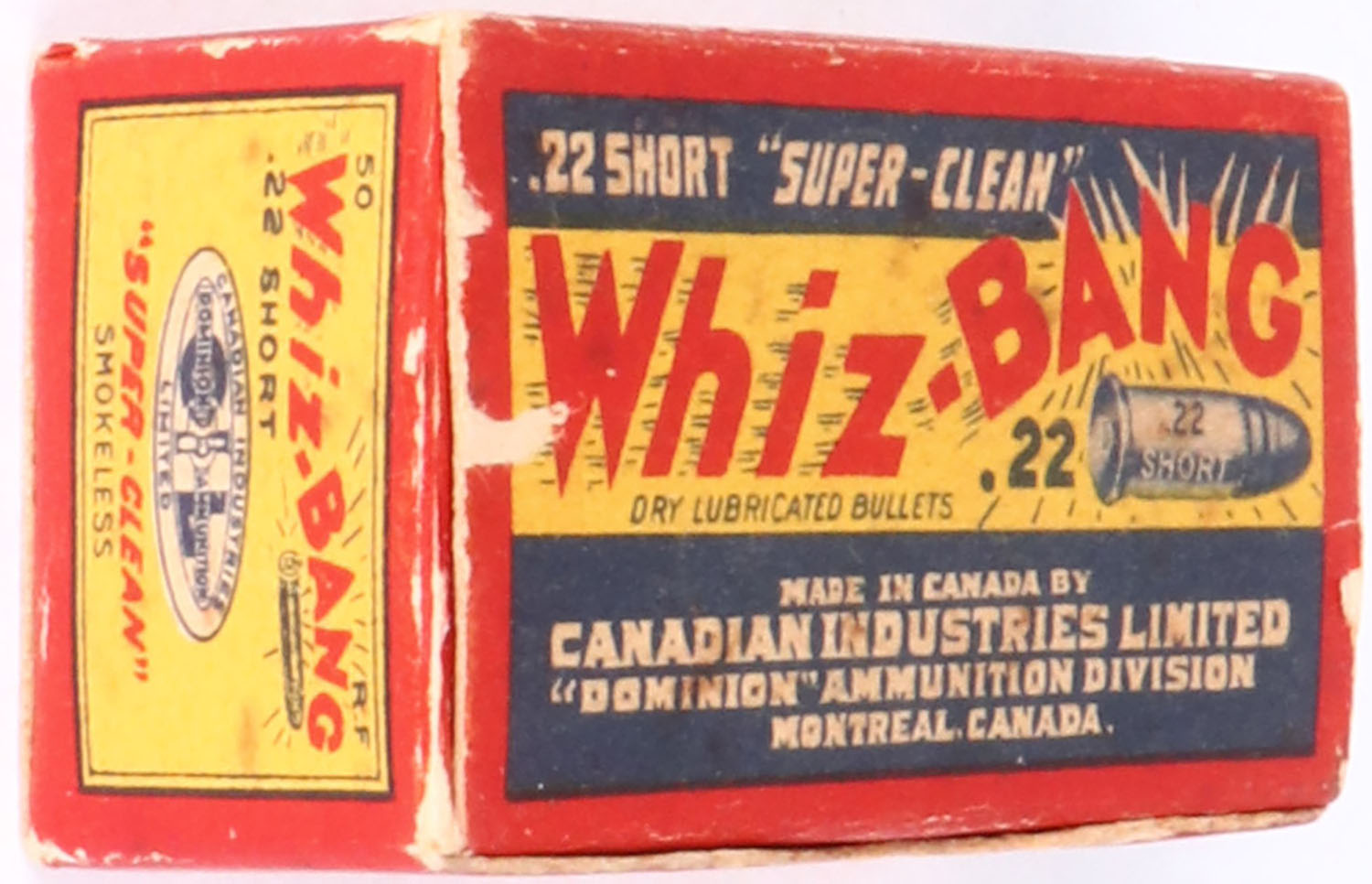 C.I.L., Whiz-Bang, .22 Short, ''Super-Clean'', Full, 1pc. Red yellow & blue box, box is solid with excellent color, minor age soiling, minor edge & corner wear, top flap is solid, ammo is excellent. Grade: Excellent - Value: 20 to 60