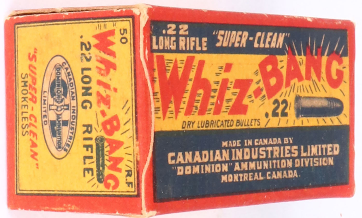 C.I.L., Whiz-Bang, .22 Long Rifle, ''Super-Clean'', Full, 1pc. Red yellow & blue box, box is solid with excellent color, very minor age soiling & corner wear, edges are crisp, end flaps are solid, ammo is very good to excellent. Grade: Excellent ++ - Value: 20 to 60