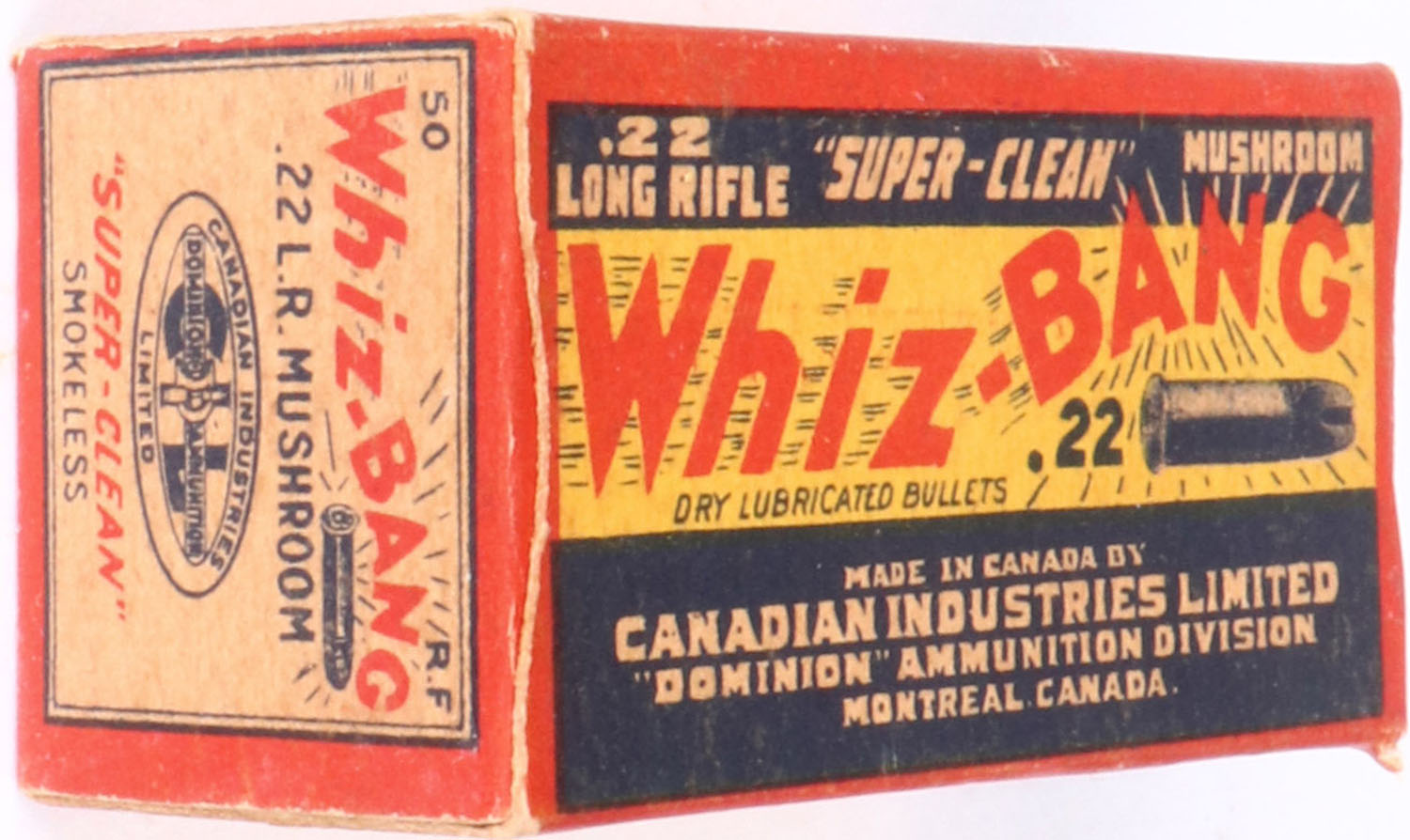 C.I.L., Whiz-Bang, .22 Long Rifle Hollow Point, ''Super-Clean'' Mushroom, Partial 47rds. 1pc. Red yellow & blue box, box is solid with excellent color, very minor age soiling & corner wear, edges are crisp, end flaps are solid, ammo is excellent. Grade: Excellent + - Value: 10 to 50