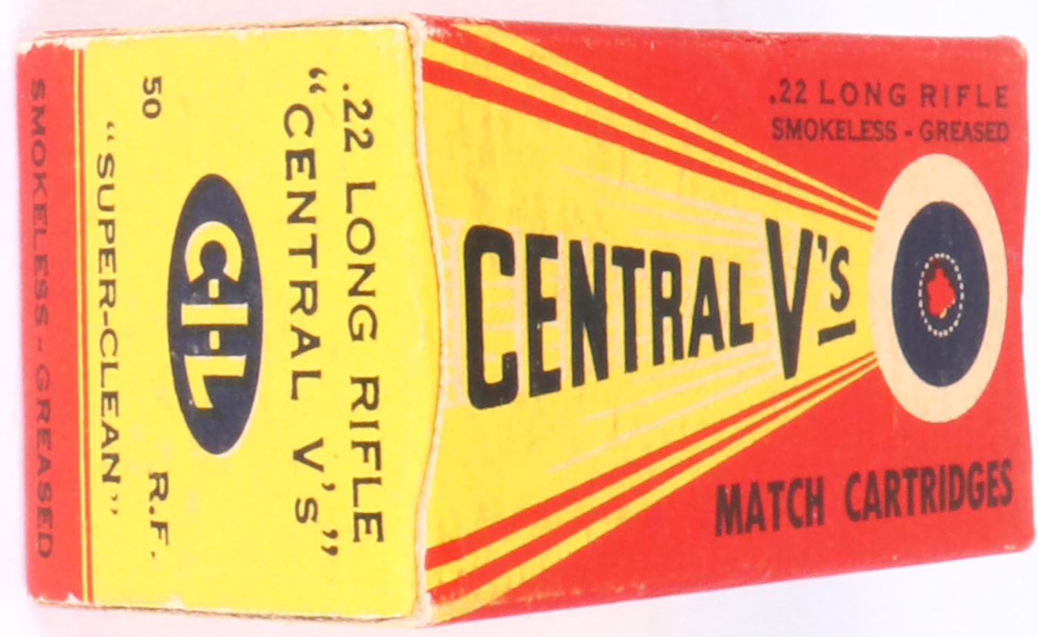 C.I.L., Central V's, .22 Long Rifle, Match Cartridges, Full, 1pc. Yellow & red box, box is solid with excellent color, very minor age soiling & corner wear, edges are crisp, end flaps are solid, ammo is very good to excellent. Grade: Excellent + - Value: 10 to 50