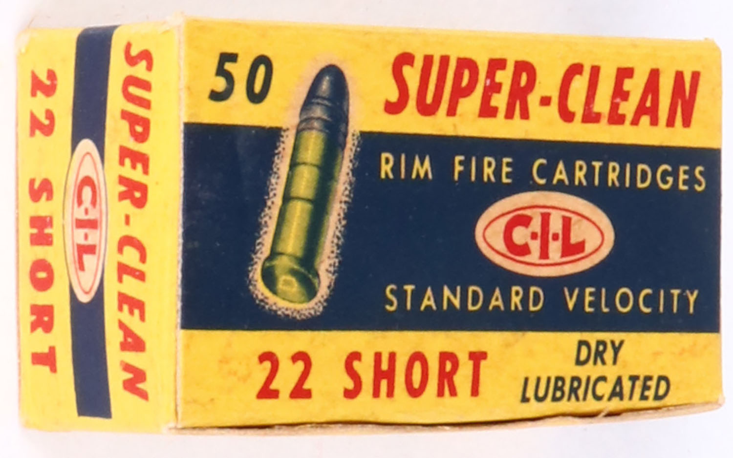 C.I.L., Super-Clean, .22 Short, Standard Velocity, Full, 1pc. Yellow blue & red box, box is solid with excellent color, only very minor age soiling, corners are mostly sharp, edges are crisp, top flap is solid, ammo is excellent. Grade: Excellent ++ - Value: 20 to 60