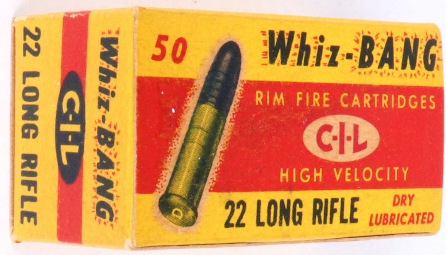 C.I.L., Whiz-Bang, .22 Long Rifle, High Velocity, Full, 1pc. Yellow & red box, box is solid with excellent color, very minor age soiling, corners are sharp, edges are crisp, top flap is solid, ammo is excellent. Grade: Excellent ++ - Value: 10 to 50