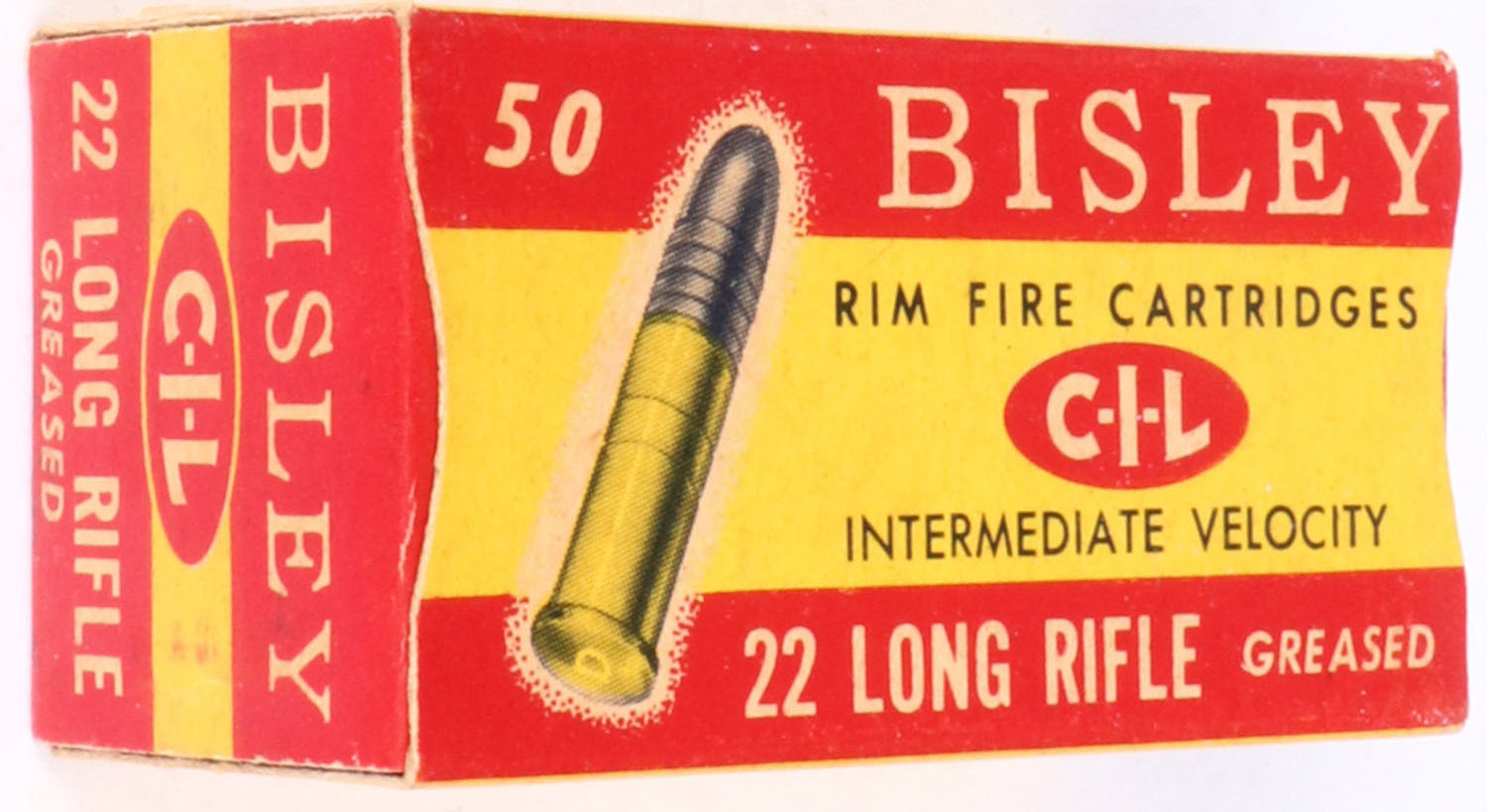 C.I.L., Bisley, .22 Long Rifle, Intermediate Velocity, Full, 1pc. Yellow & red box, box is near mint with excellent to minty color, only has very minor age soiling, corners are mostly sharp, edges are crisp, end flaps are solid, ammo is excellent. Grade: Excellent ++ - Value: 10 to 50