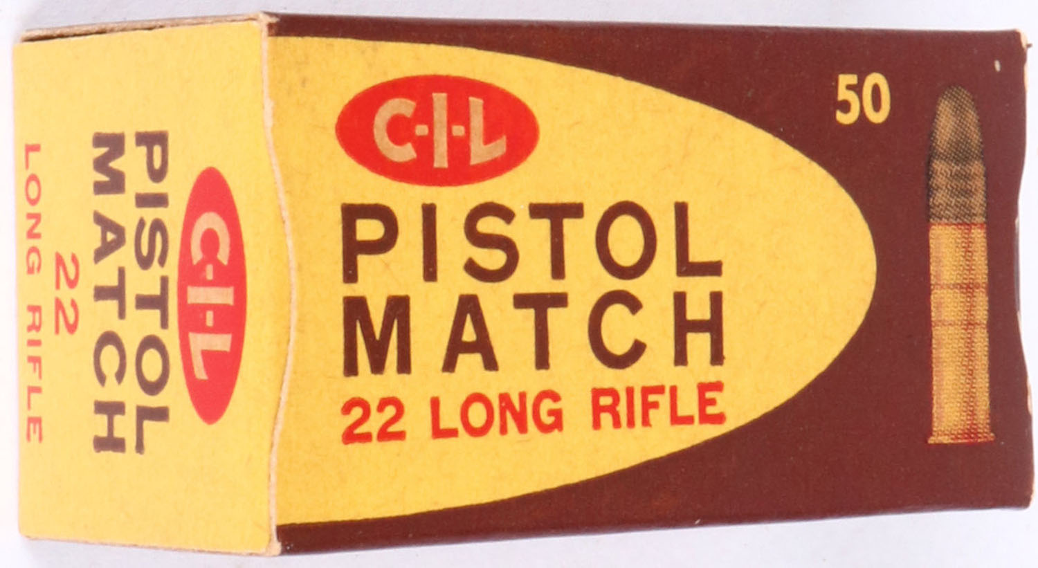 C.I.L., Pistol Match, .22 Long Rifle, Full, 1pc. Brown yellow & red box, box is solid with excellent color, very minor age soiling & corner wear, edges are crisp, end flaps are solid, ammo is excellent. Grade: Excellent ++ - Value: 10 to 50