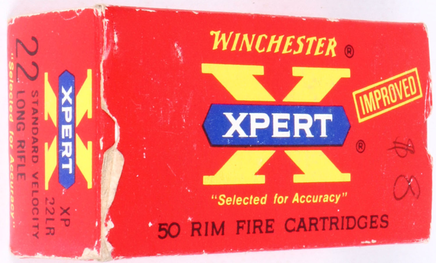 Winchester (Australia), Xpert Improved, .22 Long Rifle, Standard Velocity, Full, 1pc. Red yellow & blue box, box is solid with excellent color, top has been written on, some edge & corner wear, end flaps are solid, ammo is minty. Grade: Excellent - Value: 8 to 60