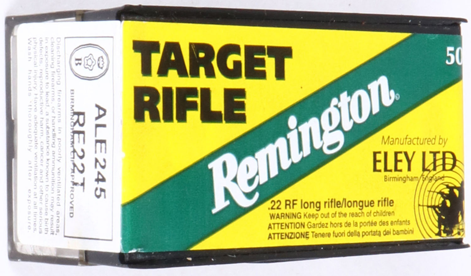 Eley-Remington, Target Rifle, .22 Long Rifle, FULL & SEALED, 2pc. Clear & black plastic tray with yellow & green sealing label, box is solid, cloudy, label is intact with minty color, ammo appears minty. Grade: Excellent + - Value: 8 to 40