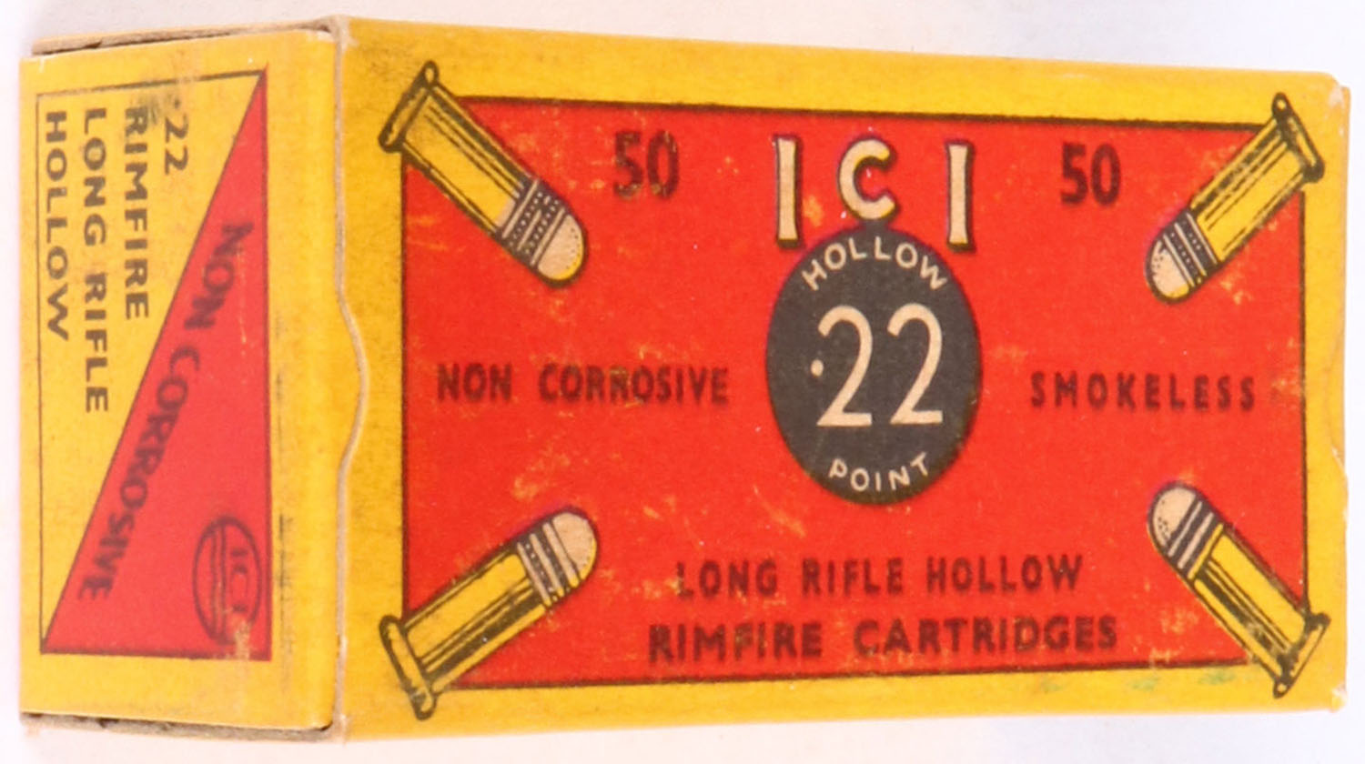 I.C.I., Rimfire Cartridges, .22 Long Rifle Hollow Point, Non Corrosive, Full, 1pc. Red & yellow box, box is solid with excellent color, very minor age soiling & shelf wear, corners are sharp, edges are crisp, end flaps are solid, ammo is excellent. Grade: Excellent - Value: 10 to 50