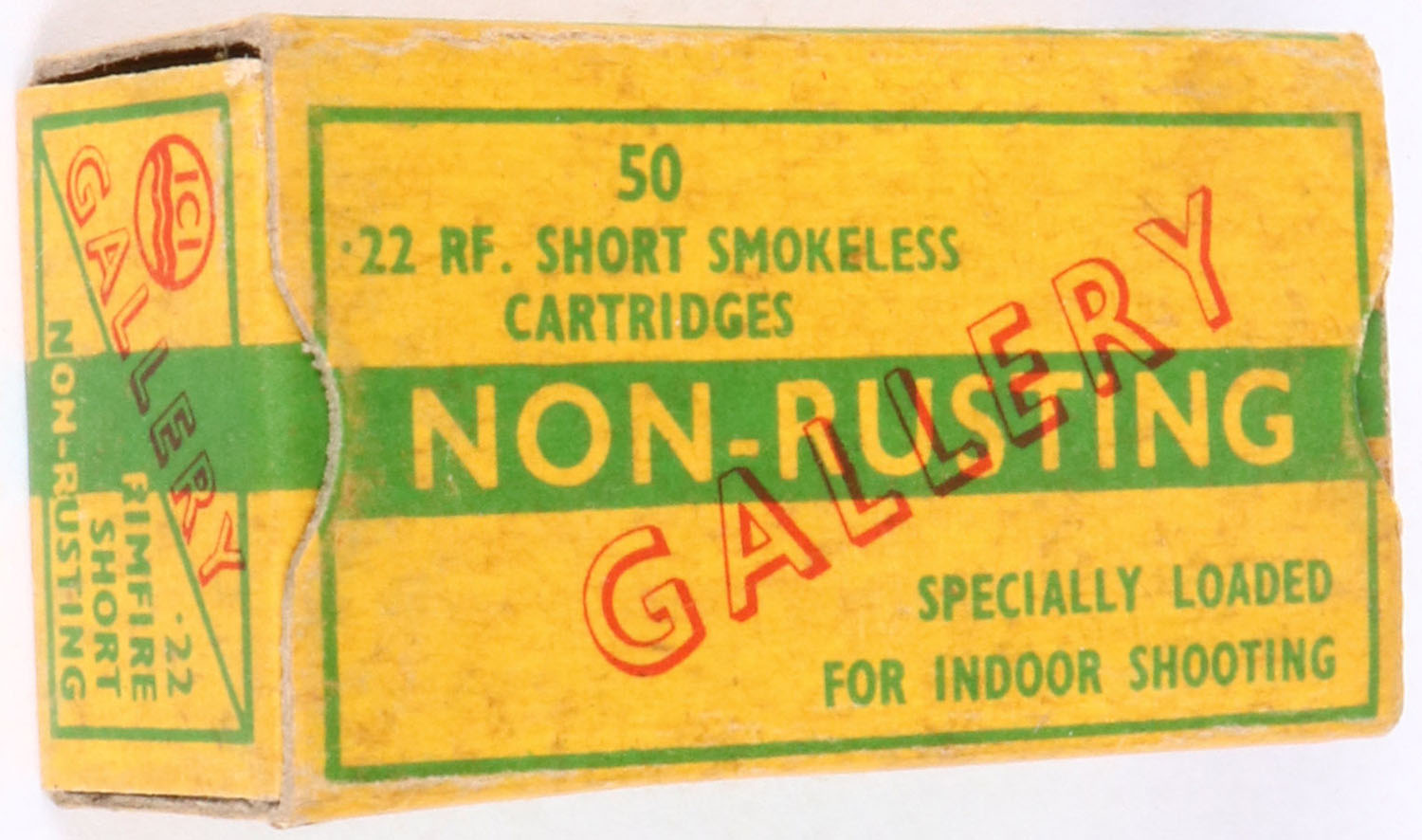 I.C.I., Gallery, .22 Short, Specially Loaded for Indoor Shooting, Full, 1pc. Yellow green & red box, box is solid with excellent color, very minor age soiling & corner wear, edges are mostly crisp, end flaps are solid, ammo is excellent. Grade: Excellent + - Value: 20 to 60