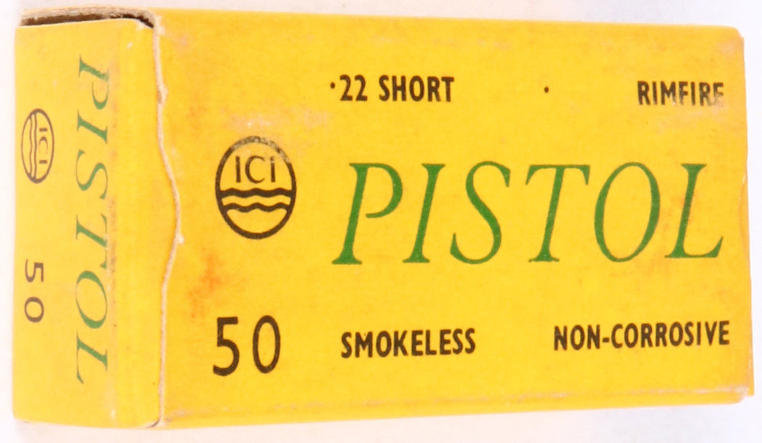 I.C.I., Pistol, .22 Short, Smokeless Non-Corrosive, Full, 1pc. Yellow box with black & green printing, box is solid with excellent color, minor age soiling & shelf wear, corners are mostly sharp, edges are crisp, end flaps are solid, ammo is excellent. Grade: Excellent - Value: 6 to 30