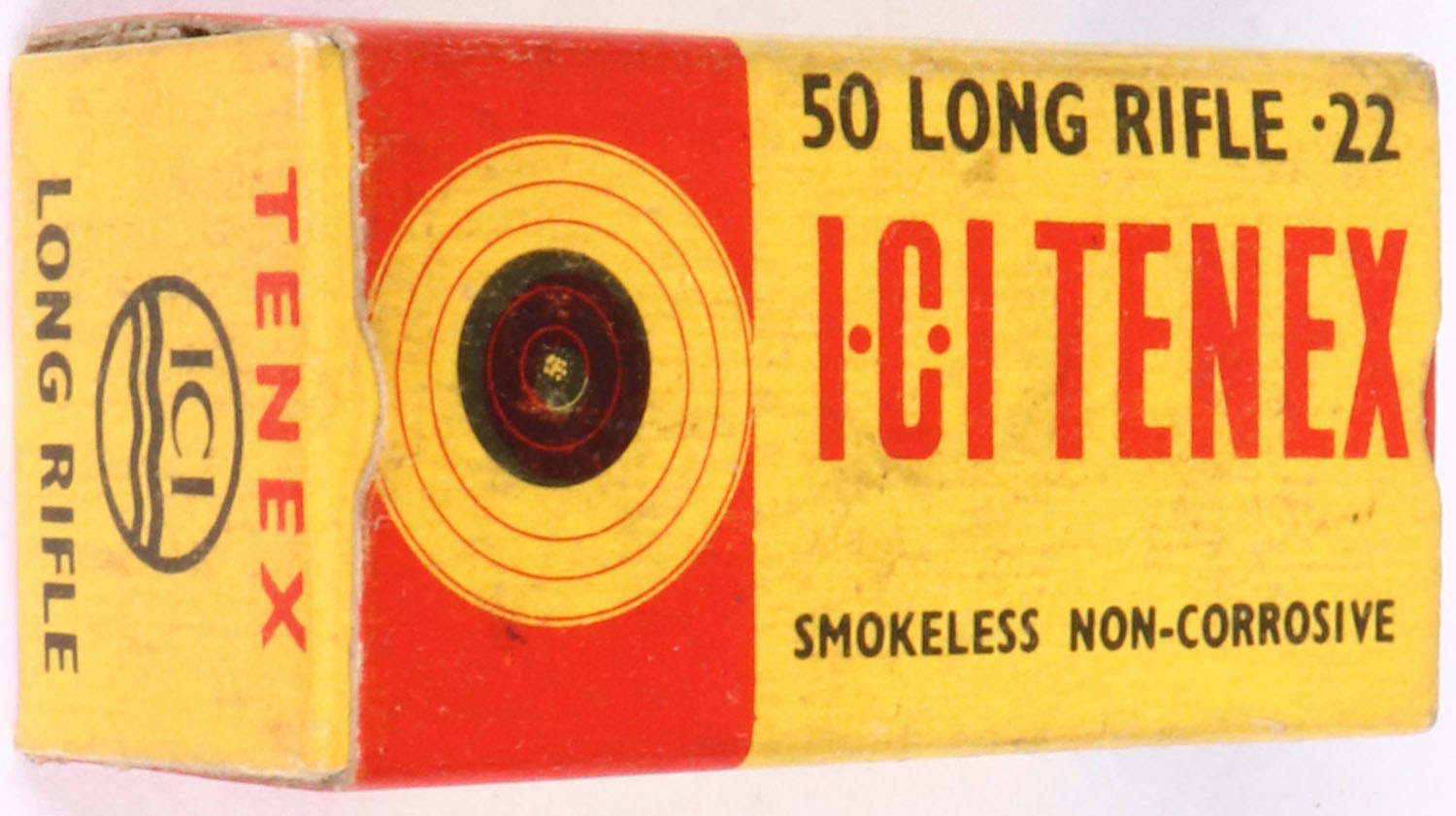 I.C.I., Tenex, .22 Long Rifle, Smokeless Non-Corrosive, Full, 1pc. Yellow & red box, box is solid with excellent color, some age soiling, very minor shelf wear, corners are mostly sharp, edges are crisp, end flaps are solid, ammo is excellent. Grade: Excellent + - Value: 8 to 40