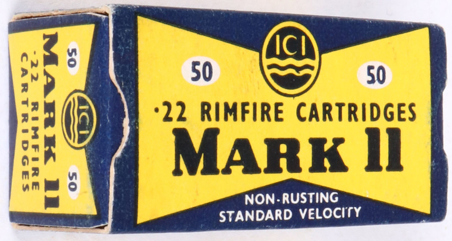 I.C.I., Mark II, .22 Long Rifle, Standard Velocity, Full, 1pc. Yellow & blue box, box is near mint with minty color, only has very minor shelf wear, corners are mostly sharp, edges are crisp, end flaps are solid, ammo is excellent. Grade: Excellent ++ - Value: 10 to 50