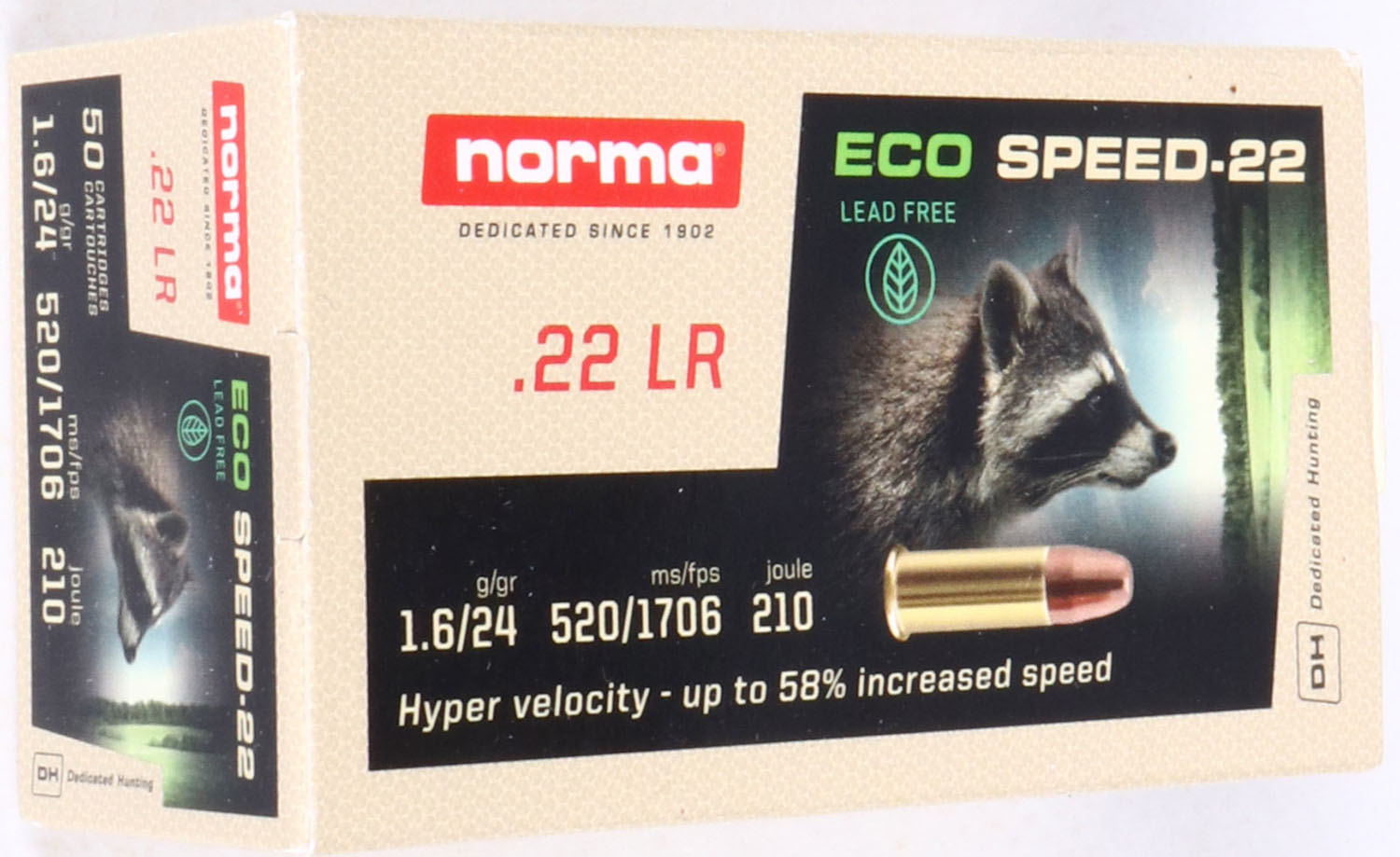 Norma, Power-22, .22 Long Rifle, 24gr. Lead Free bullet, Hyper Velocity - 1706 FPS, Full, 1pc. Multi-colored raccoon box, box is MINT with minty color, corners are sharp, edges are crisp, end flaps are solid, ammo is mint. Grade: MINT - Value: 10 to 50
