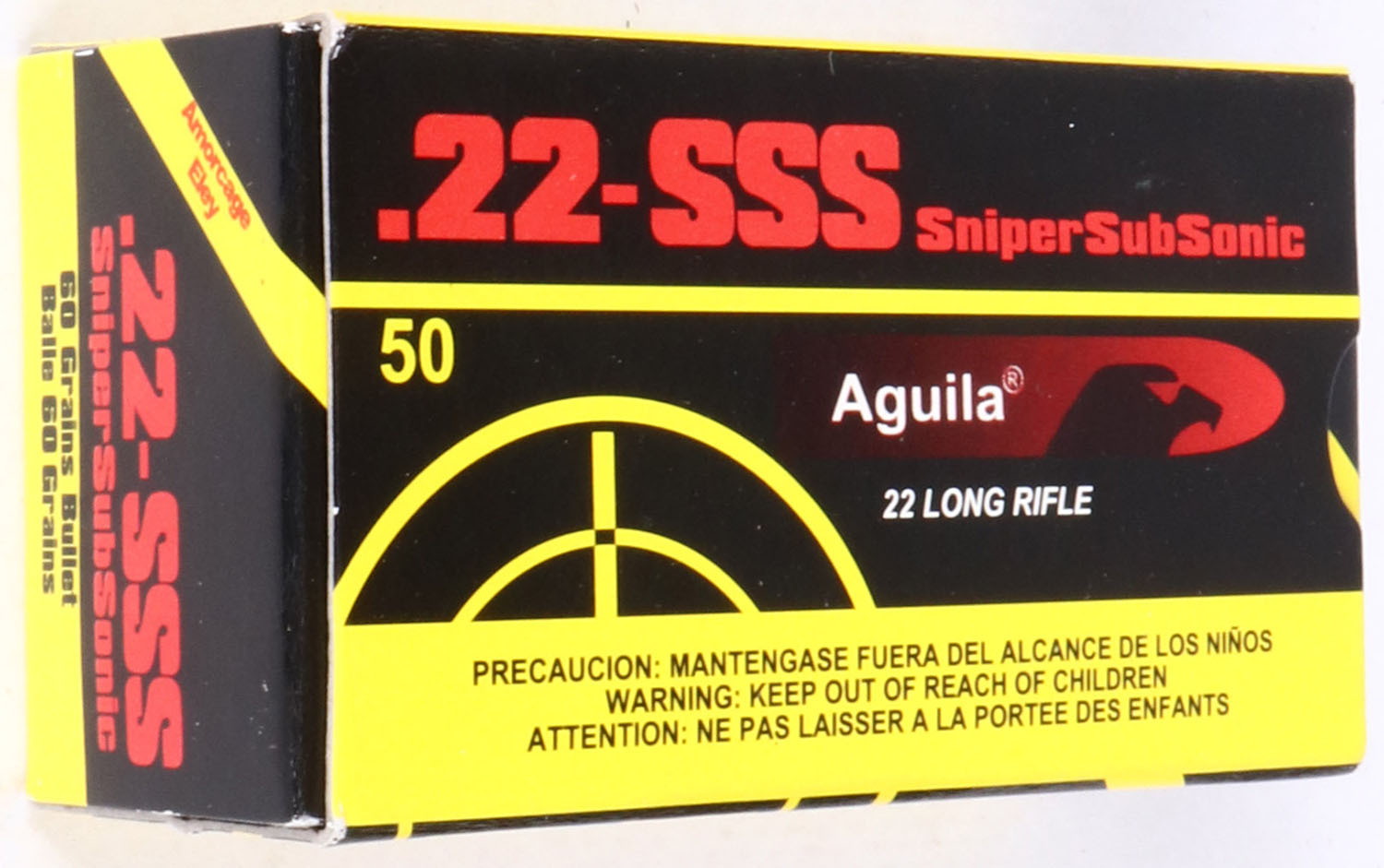 Aguila, SniperSubSonic, .22 Long Rifle, 60 Grain Bullet, Full, 1pc. Black yellow & red box, box is MINT with mint color, corners are sharp, edges are crisp, end flaps are solid, ammo is mint. Grade: MINT - Value: 8 to 40