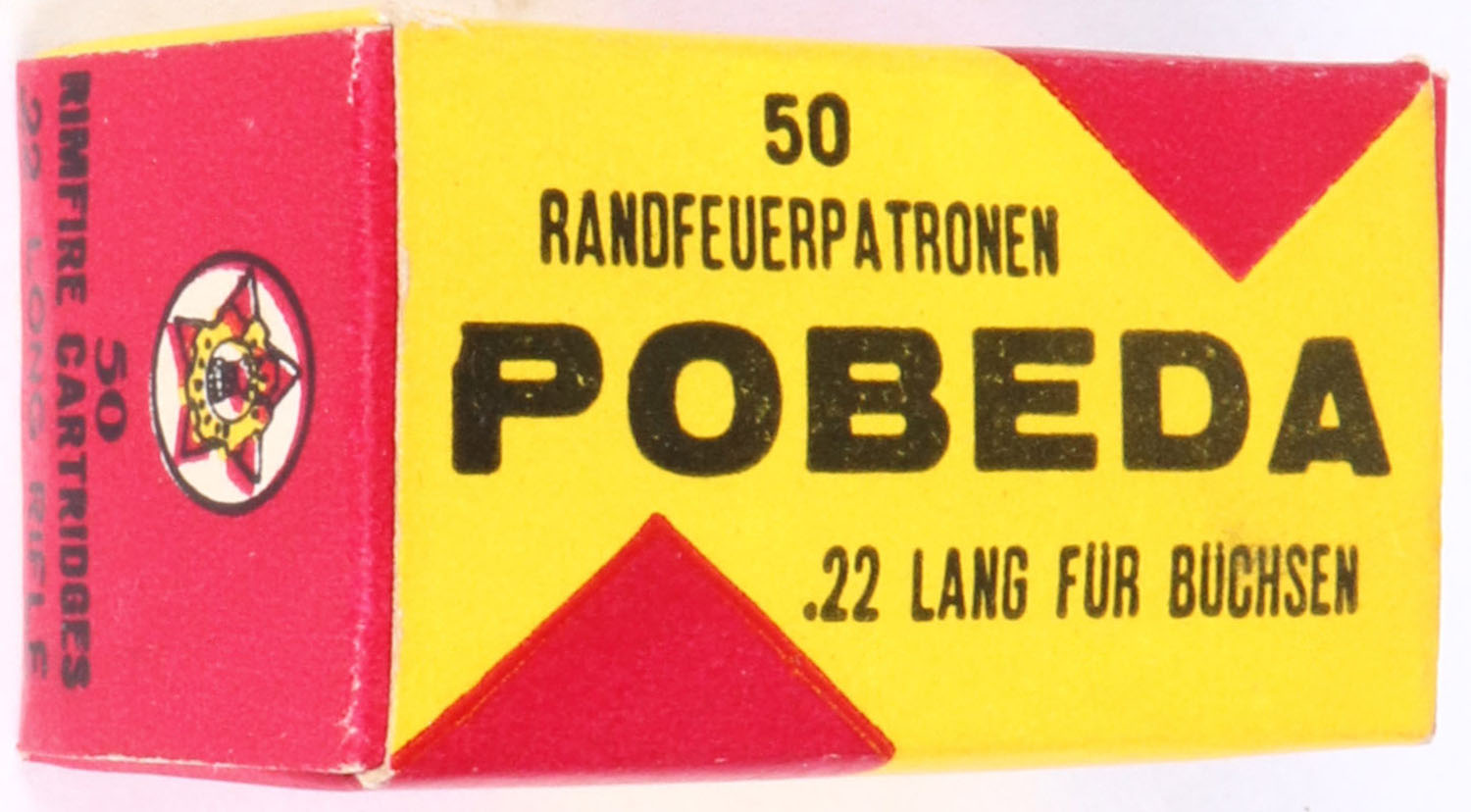 Pobeda, Rim-Fire Cartridges, .22 Long Rifle, Erosion-Proof Smokeless Rustproof, Full, 1pc. Yellow red & black box, box is MINT with minty color, corners are sharp, edges are crisp, end flaps are solid, ammo is excellent. Grade: MINT - Value: 6 to 30