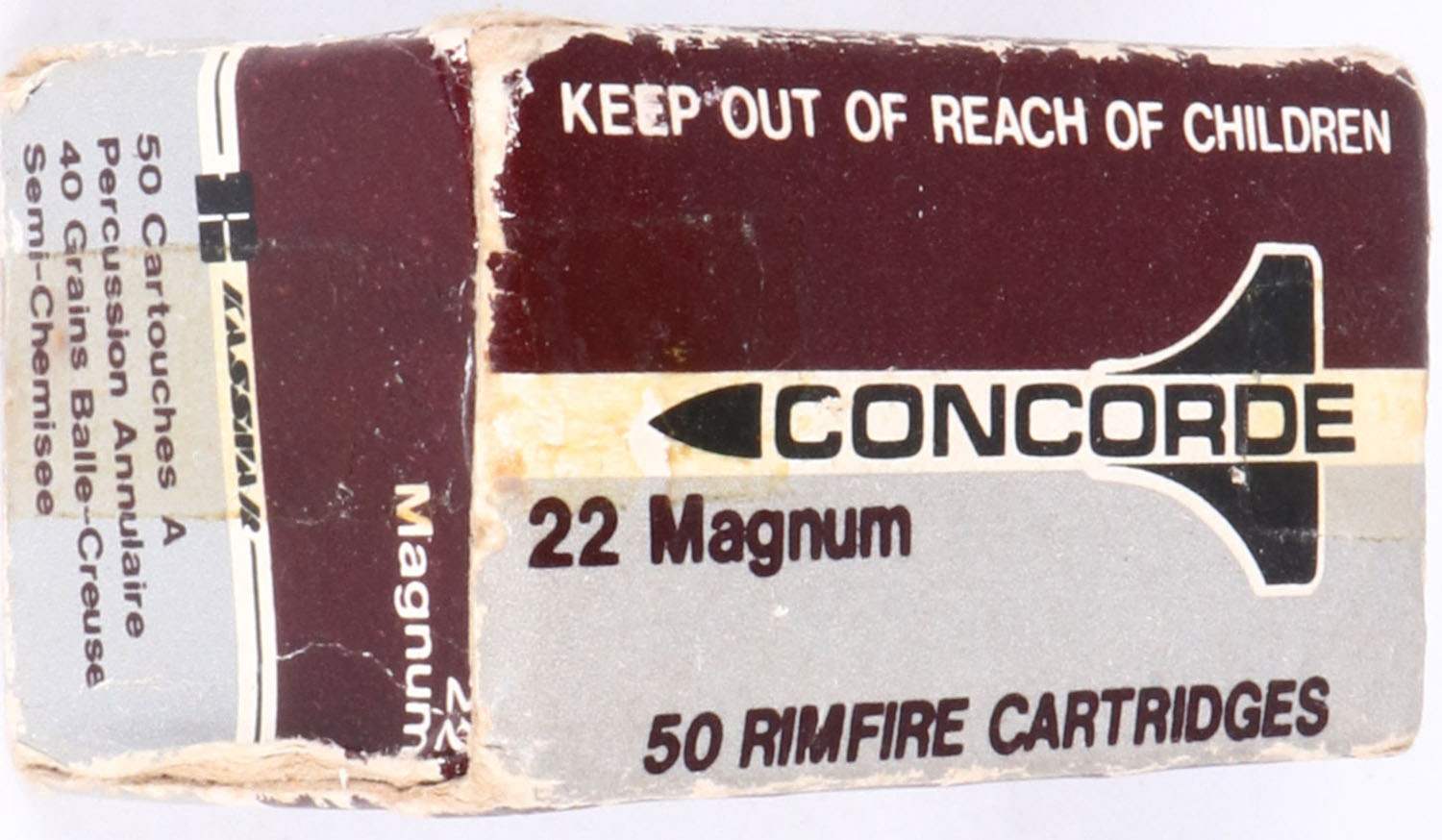 Arms Corporation of the Philippines, Concorde, .22 Magnum Hollow Point, Full, 1pc. Purple silver & white box, box is solid with excellent color, tape stains on both ends, edge & corner wear, end flaps are solid, ammo is minty. Grade: Very Good ++ - Value: 2 to 20