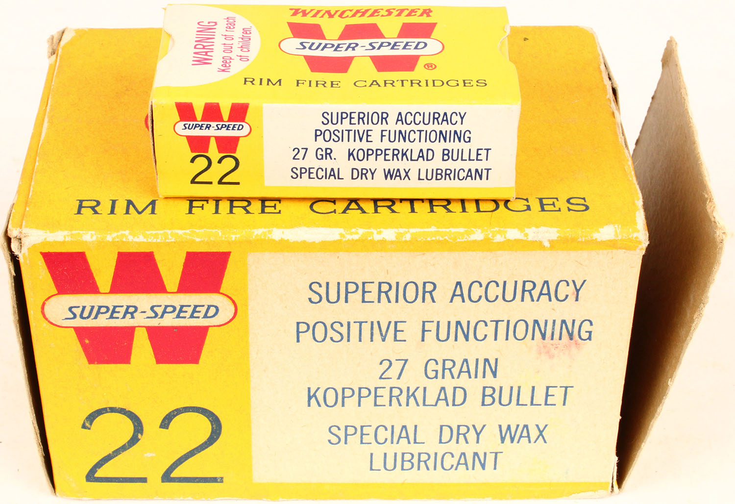 Winchester, Super-Speed, .22 Short Hollow Point, Full, 500rds. 1pc. Yellow red & white brick, brick is solid with excellent color, some age soiling, right end flap is torn, some edge & corner wear, inside boxes are minty. Grade: Very Good + - Value: 50 to 250