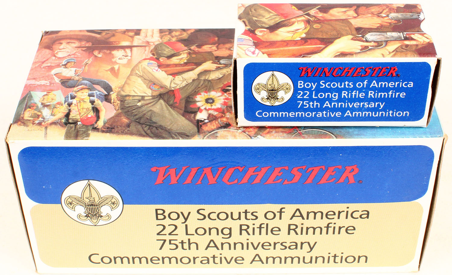 Winchester, Boy Scouts of America 75th Anniversary, .22 Long Rifle, High Velocity, 1pc., Full 500rds. brick, multi colored picture of Boy Scouts, great full color image, brick is mint, minty color, sharp corners, crisp edges, rigid end flaps, inside boxes are mint. Grade: Mint - Value: 100 to 200
