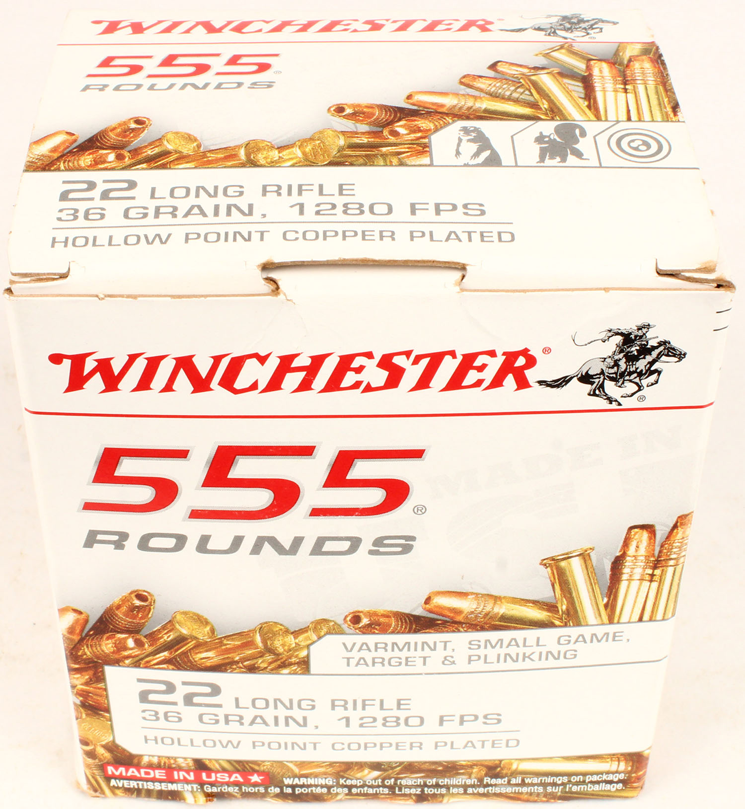 Winchester, .22 Long Rifle Hollow Point, 36 Grain Copper Plated, 1280 FPS, Full, 555rds. 1pc. White & red bulk box, box is near mint with minty color, only very minor corner wear, edges are crisp, top flap is solid, ammo is minty. Grade: Excellent ++ - Value: 30 to 60