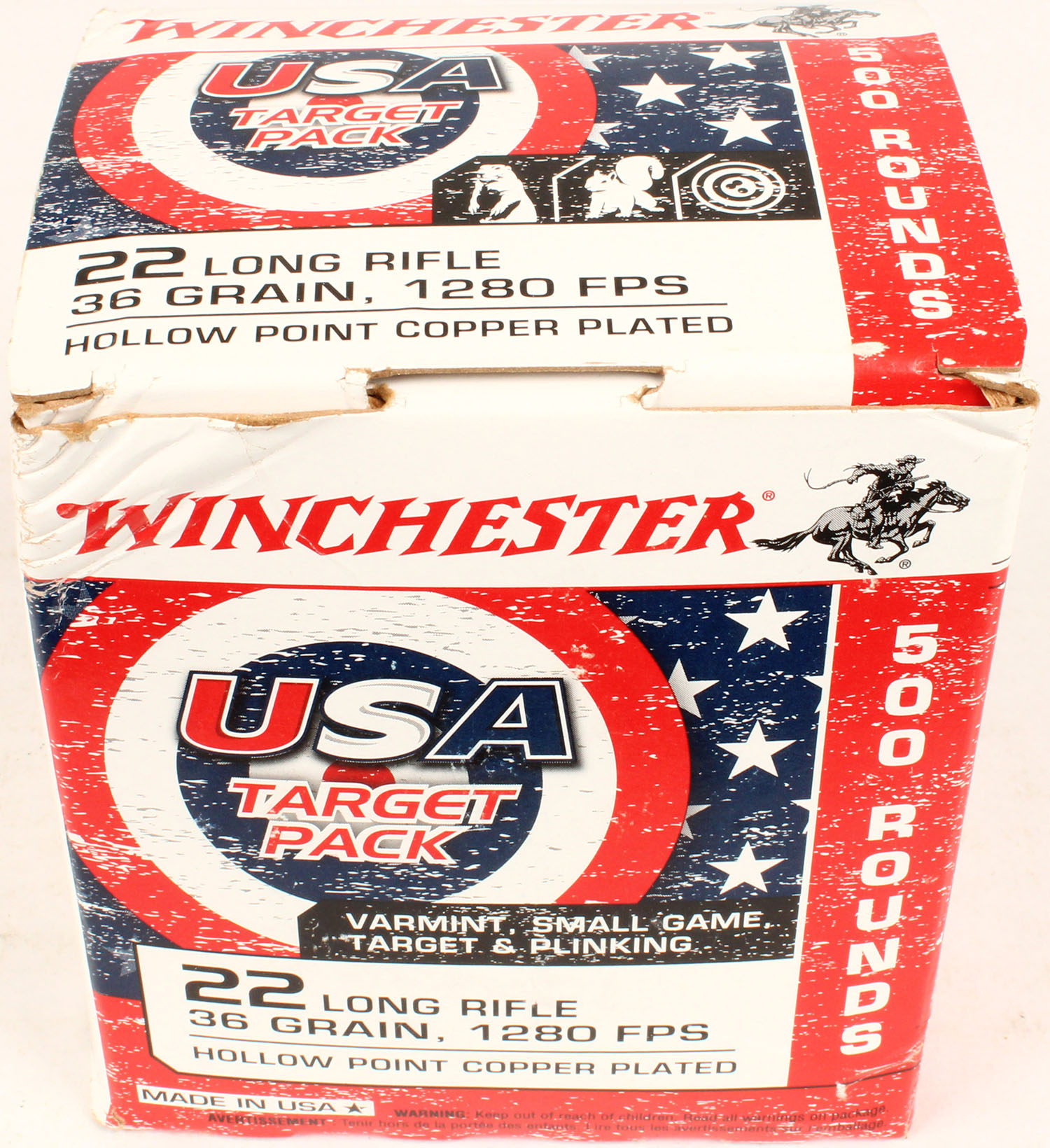 Winchester, USA Target Pack, .22 Long Rifle Hollow Point, 36 Grain Copper Plated, Full, 500rds. 1pc. White red & blue bulk box, box is solid with minty color, corner ding on top front corner, some corner wear, edges are crisp, top flap is solid, ammo is mint. Grade: Excellent - Value: 30 to 60