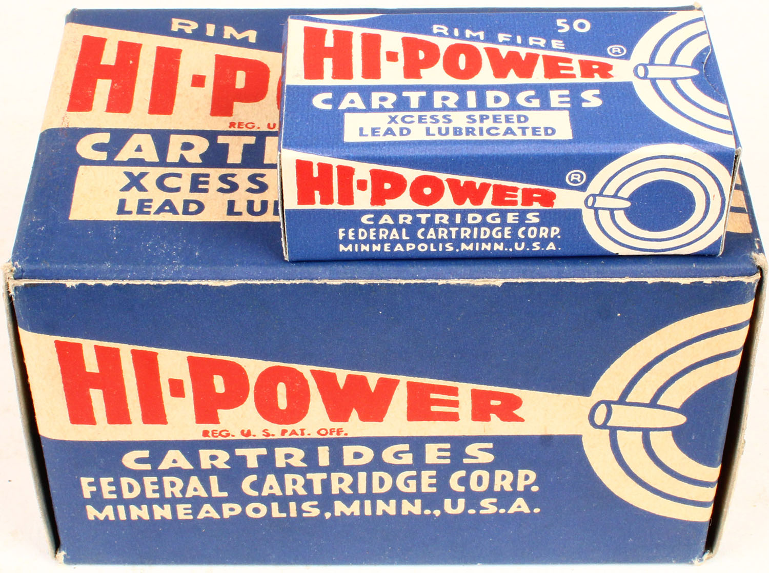 Federal, Hi-Power, .22 Short, Xcess Speed, Full, 500rds. 1pc. Blue white & red brick, brick is solid with excellent color, minor age soiling, very minor corner wear, edges are crisp, end flaps are solid, inside boxes are mint. Grade: Excellent ++ - Value: 40 to 120