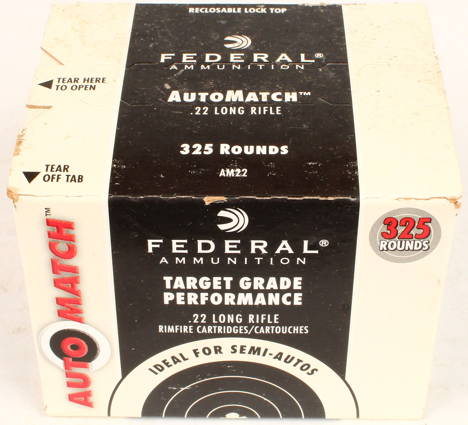 Federal, Auto Match, .22 Long Rifle, 40 Gr. Solid, 1200 FPS, FULL & SEALED, 325rds., 1pc. Black white & red bulk box, box is solid with excellent to minty color, only very minor age soiling & corner wear, edges are crisp. Grade: Excellent ++ - Value: 20 to 60