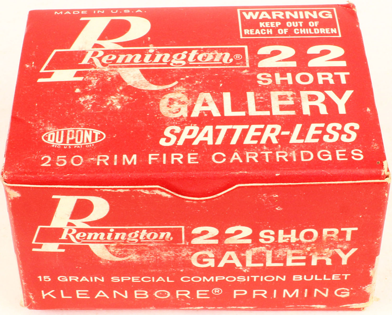 Remington, Spatter-Less, .22 Short, Gallery, Full, 250rds., 1pc. Red & white bulk box, box is solid with excellent color, shelf wear, very minor corner wear, edges are crisp, top flap is solid, ammo is very good. Grade: Excellent + - Value: 30 to 120
