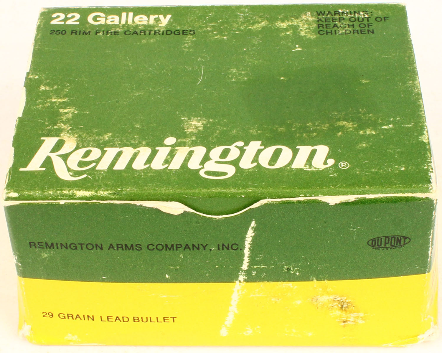 Remington, 22 Gallery, .22 Short, 29 Grain Lead Bullet, Full, 250rds. 1pc. Green yellow & white bulk box, box is solid with excellent color, shelf wear, minor edge & corner wear, top flap is solid, ammo is excellent. Grade: Excellent - Value: 10 to 50